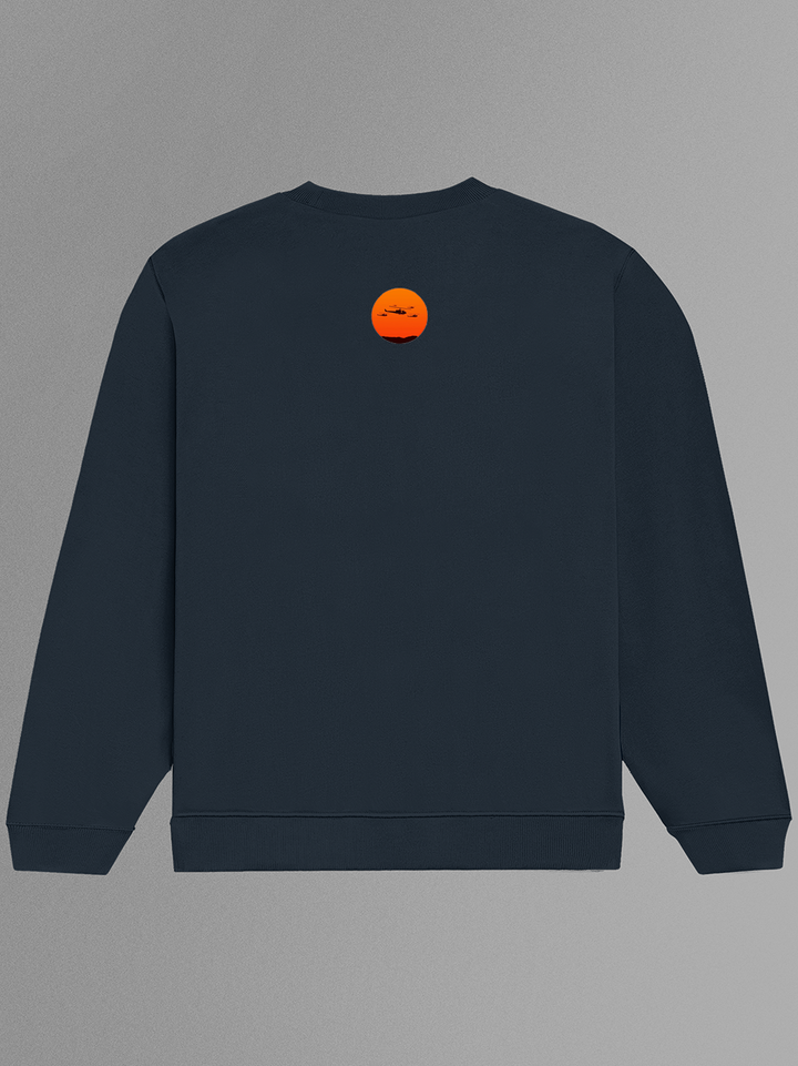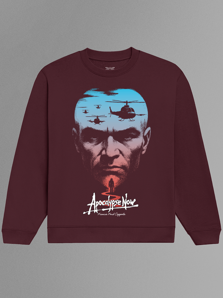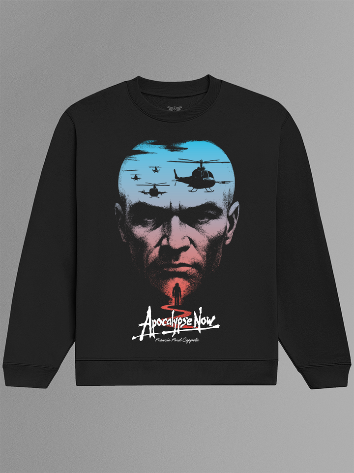 Product features a haunting composite of Colonel Kurtz’s face, his head filled with helicopters slicing through a blue sky. A lone figure walks into a blood-red glow below — the visual spiral of Apocalypse Now, blending madness, war, and myth. Part of the Cult Movies Collection.