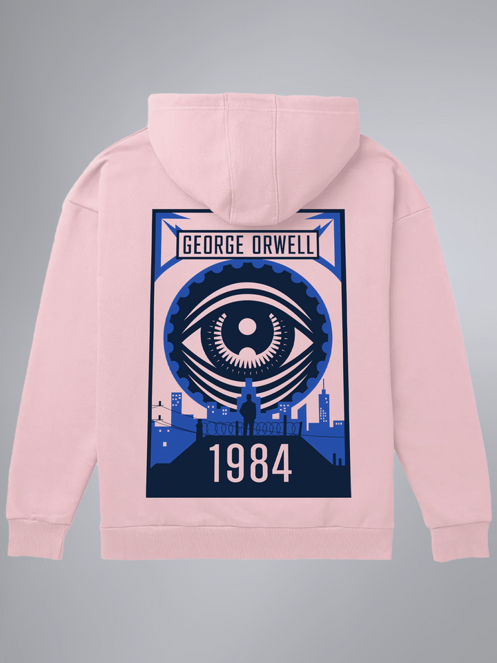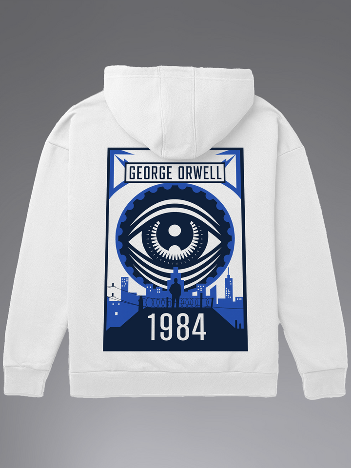 Product features a towering mechanical eye overlooking a stark cityscape — all rendered in bold, propaganda-style geometry and Orwellian blue tones. Paying homage to 1984, the design captures the mood of constant surveillance, state power, and silent resistance. From the looming figure on the walkway to the gears of the ever-watching eye, every element echoes Orwell’s chilling vision of control. Part of the Counterculture Books Collection.