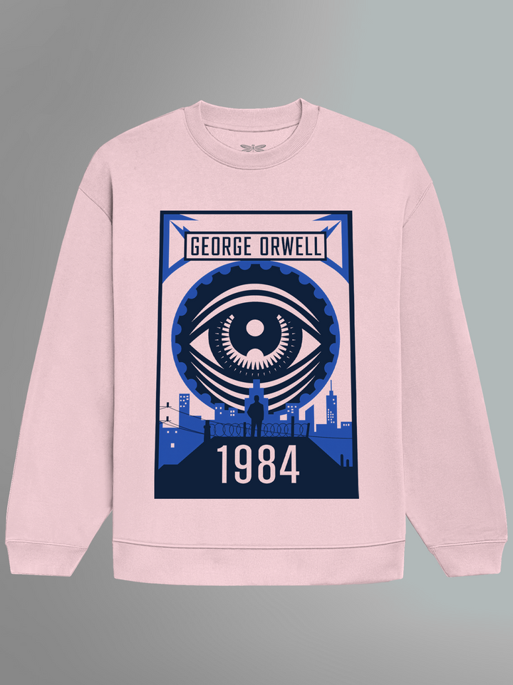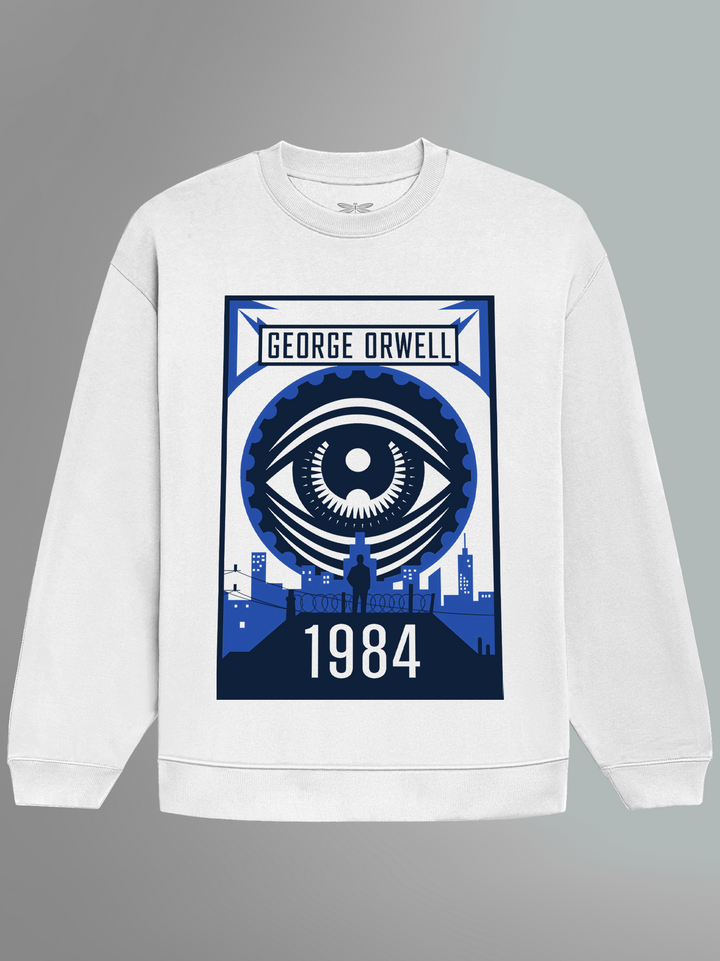 Product features a towering mechanical eye overlooking a stark cityscape — all rendered in bold, propaganda-style geometry and Orwellian blue tones. Paying homage to 1984, the design captures the mood of constant surveillance, state power, and silent resistance. From the looming figure on the walkway to the gears of the ever-watching eye, every element echoes Orwell’s chilling vision of control. Part of the Counterculture Books Collection.
