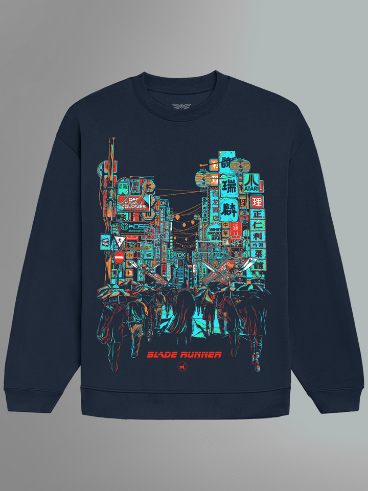 Product features a rain-soaked street lit by a blaze of neon signs — crowded umbrellas, Kanji billboards, and a lone trench-coated figure at the center. Referencing the visual chaos of Blade Runner’s Los Angeles 2019, the design captures its noir atmosphere, cyberpunk melancholy, and the haunting beauty of futures imagined. Part of the Cult Movies Collection.