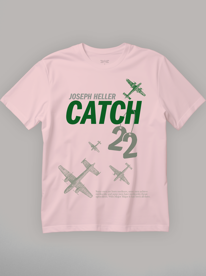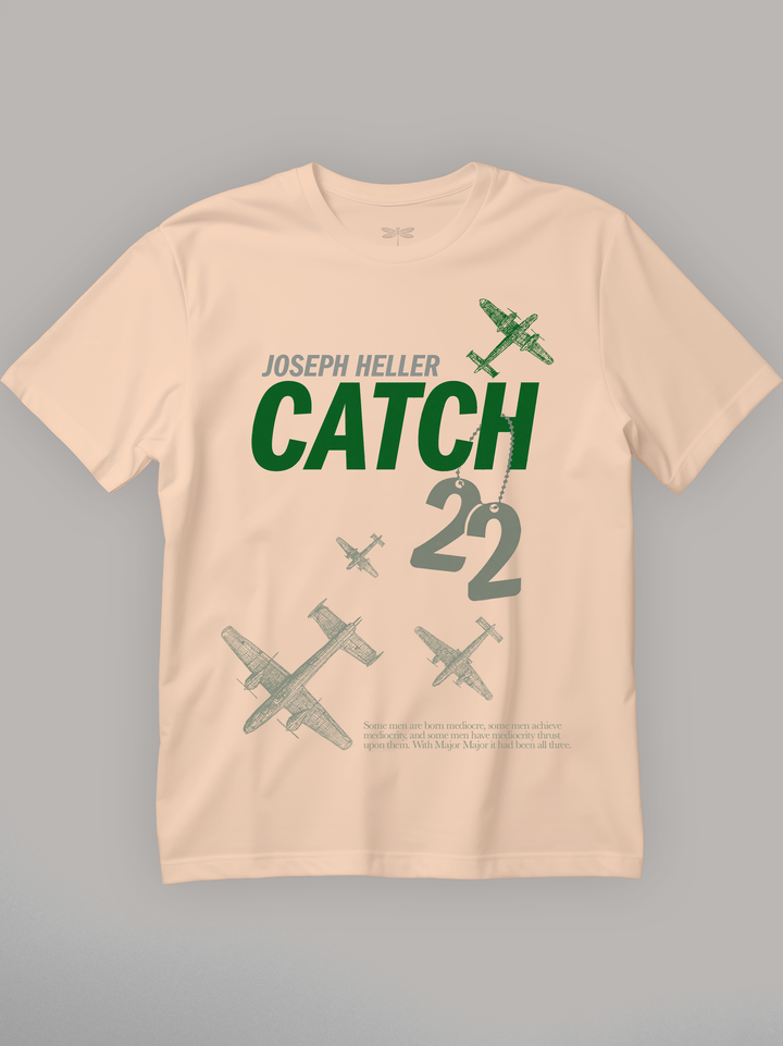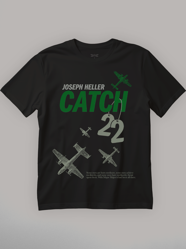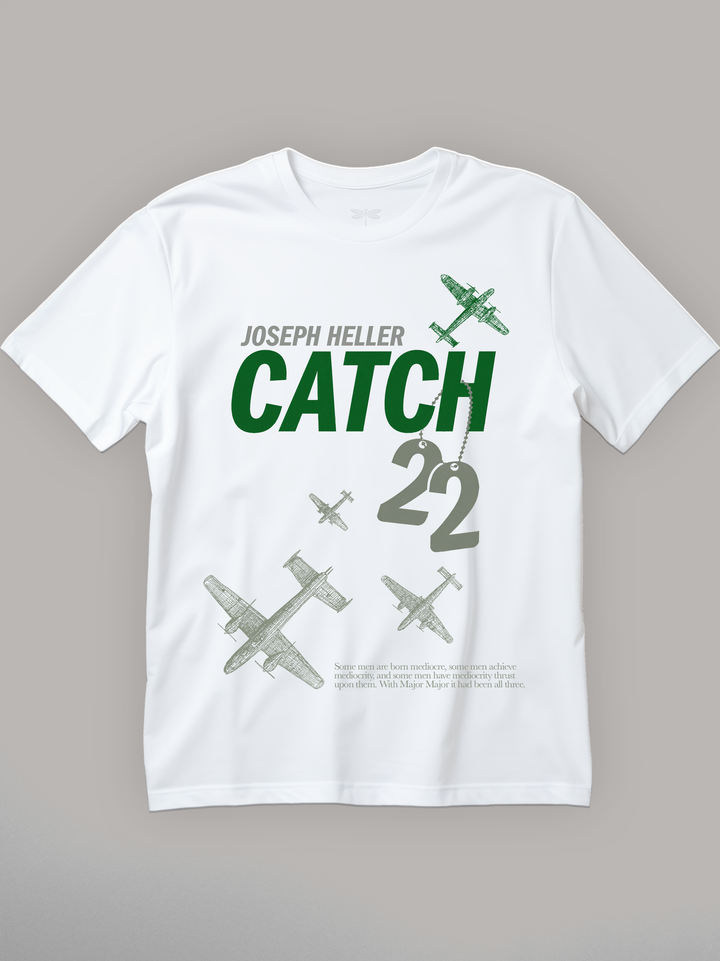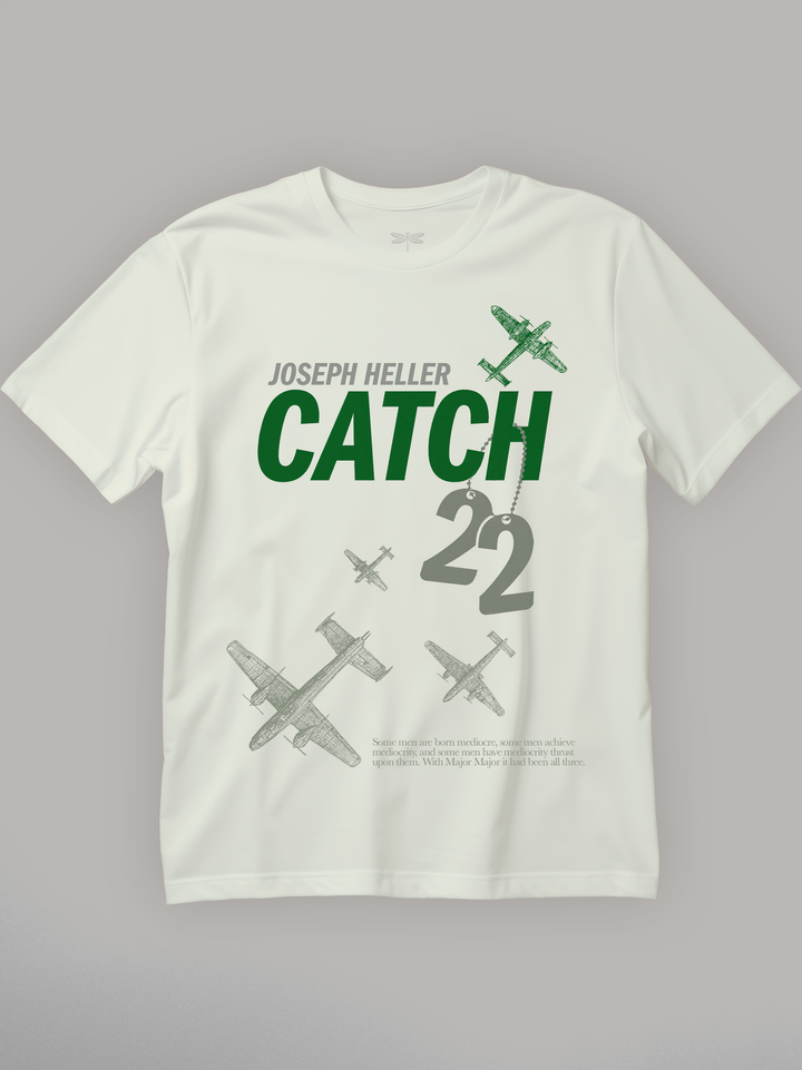 Product features a bold green “CATCH” paired with metallic dog tags bearing the number 22, suspended mid-air like a contradiction. Surrounding the title, sketched bomber planes float in disarray — evoking the chaotic logic of war and the absurdity at the heart of Joseph Heller’s novel. The quote below, about the inevitability of mediocrity, adds dry irony to the clean composition. A crisp tribute to bureaucratic madness and circular reasoning. Part of the Counterculture Books Collection.