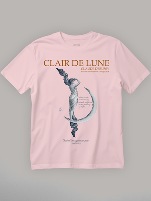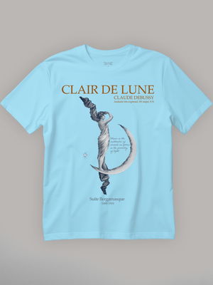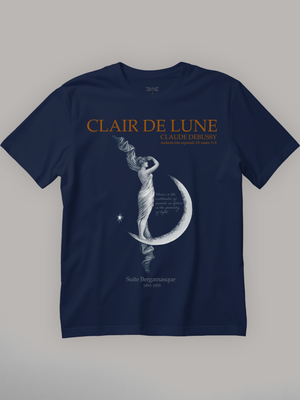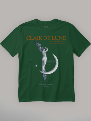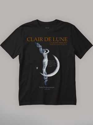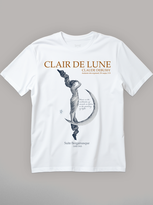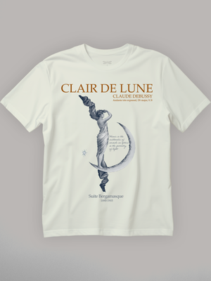 Product features a reimagined 19th-century illustration of a woman standing upon a crescent moon — a quiet homage to Claude Debussy’s Clair de Lune, composed between 1890 and 1905 as part of his Suite Bergamasque. The artwork nods to the same sense of solitude and wonder that shaped the piece, a moment where music drifts like moonlight over still water — poetic, deliberate, and timeless.