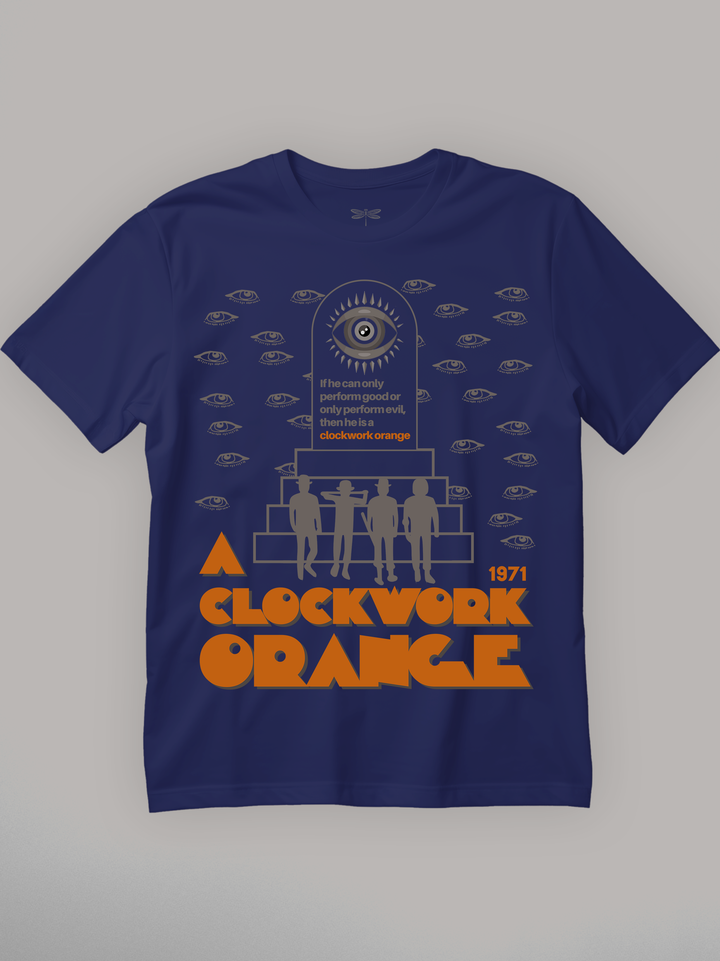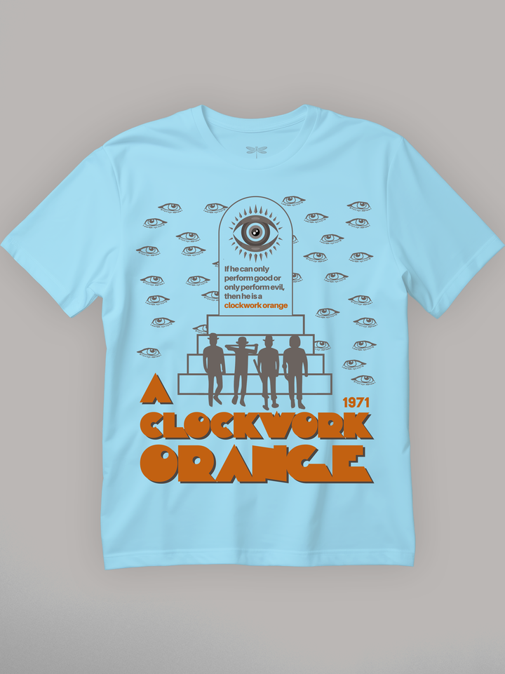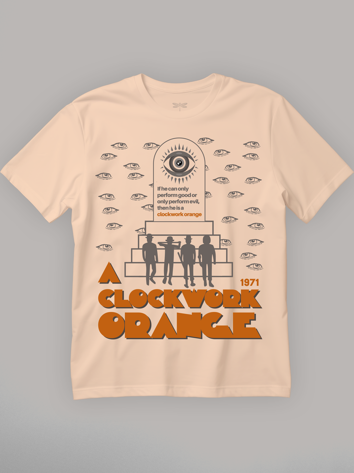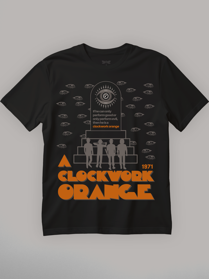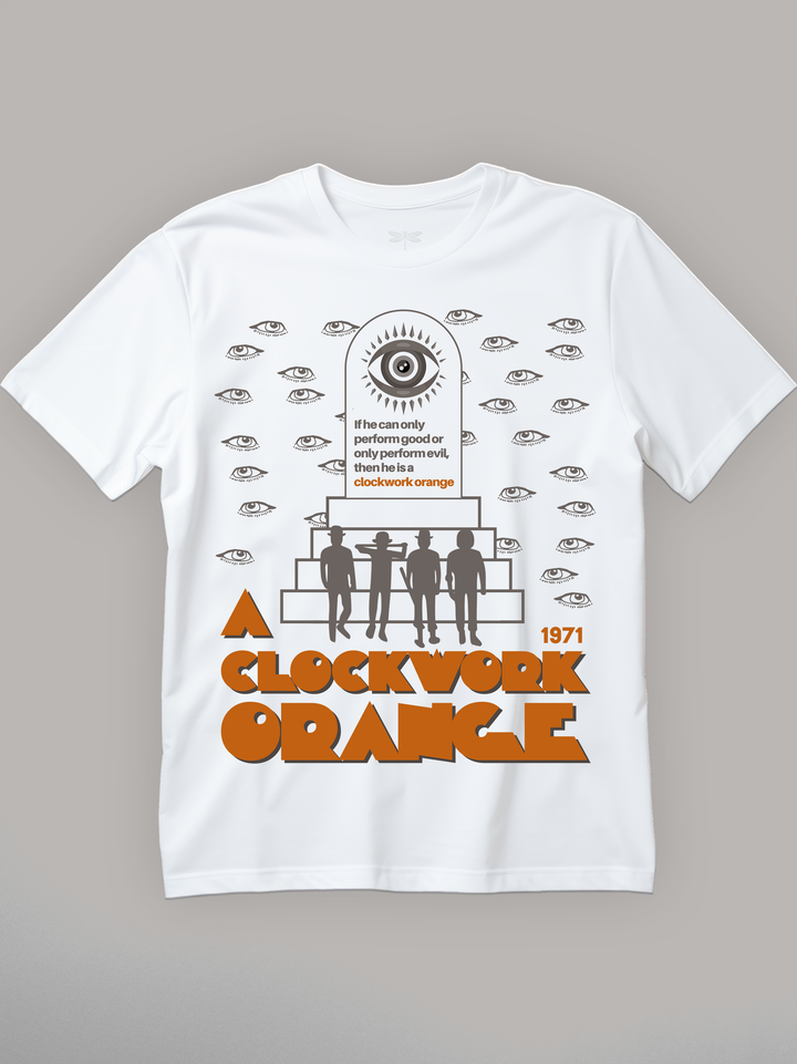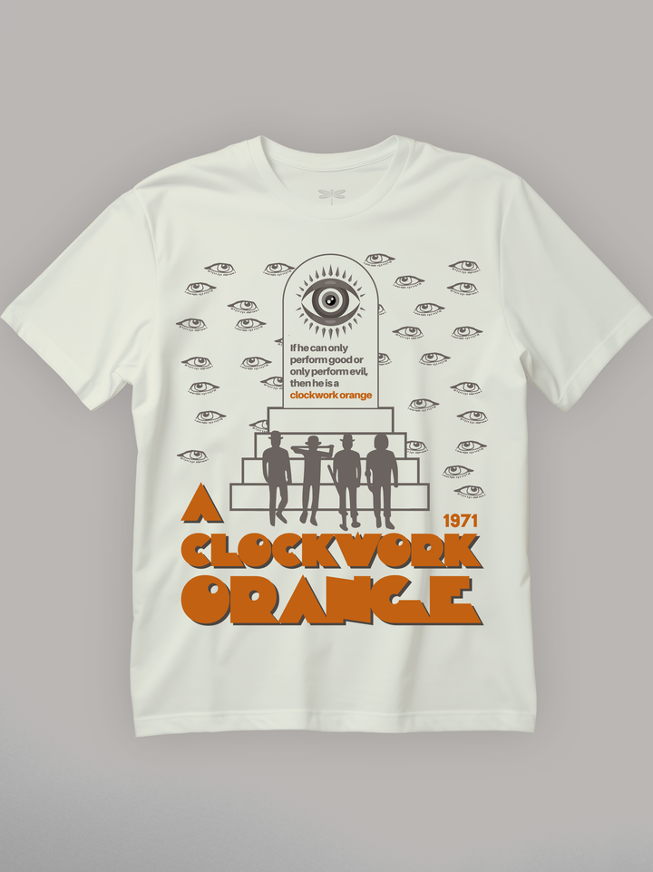Features a minimalist illustration inspired by A Clockwork Orange, depicting four silhouetted figures standing below an archway with an all-seeing eye — a symbol of control and conditioning. Surrounded by watchful eyes and paired with the quote, “If he can only perform good or only perform evil, then he is a clockwork orange,” the design captures the film’s surreal philosophy in stark grey and orange linework. Part of the Cult Movies collection.