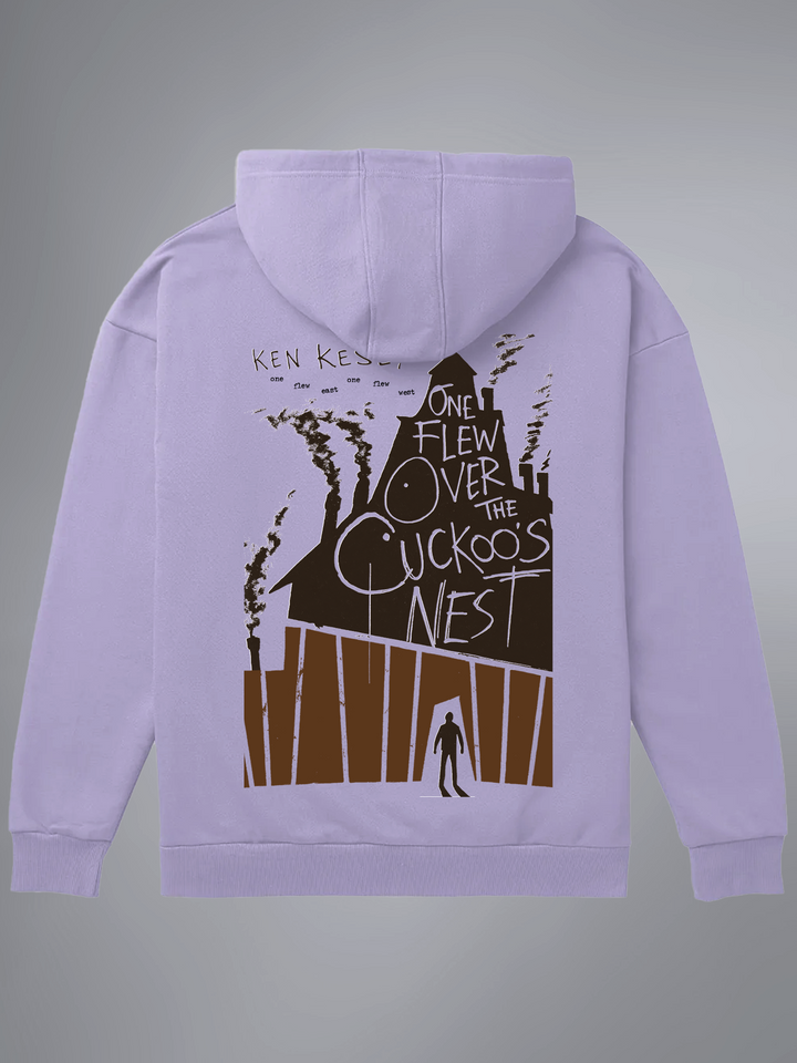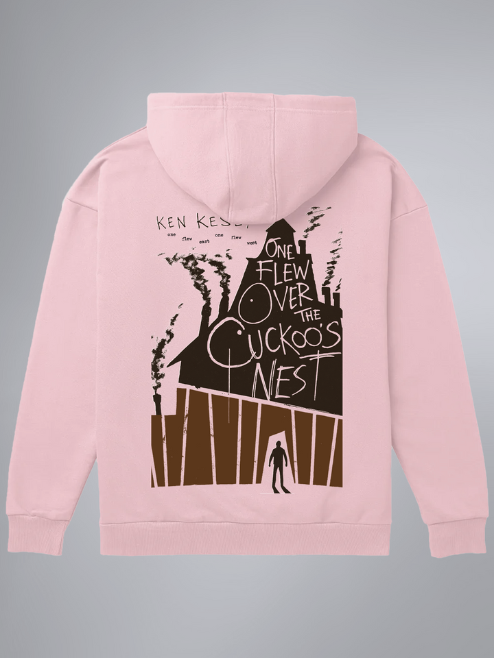 Product features a shadowy institutional facade with crooked smokestacks rising above — the building warped and looming like a bad dream. The hand-lettered title is scrawled across the roof, while a lone figure stands silhouetted in the doorway below. Referencing Ken Kesey’s indictment of mental health systems and conformity, the design captures the suffocating structure that McMurphy challenges — and the fragile hope of walking out. Part of the Counterculture Books Collection.