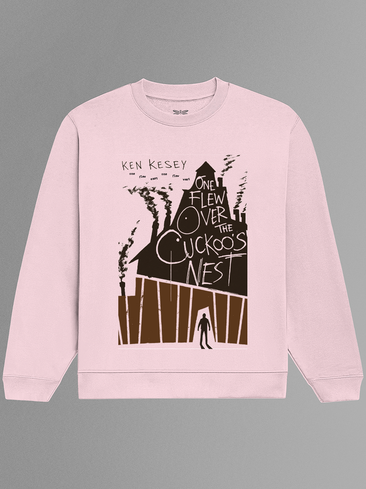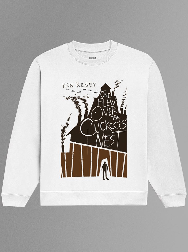 Product features a shadowy institutional facade with crooked smokestacks rising above — the building warped and looming like a bad dream. The hand-lettered title is scrawled across the roof, while a lone figure stands silhouetted in the doorway below. Referencing Ken Kesey’s indictment of mental health systems and conformity, the design captures the suffocating structure that McMurphy challenges — and the fragile hope of walking out. Part of the Counterculture Books Collection.