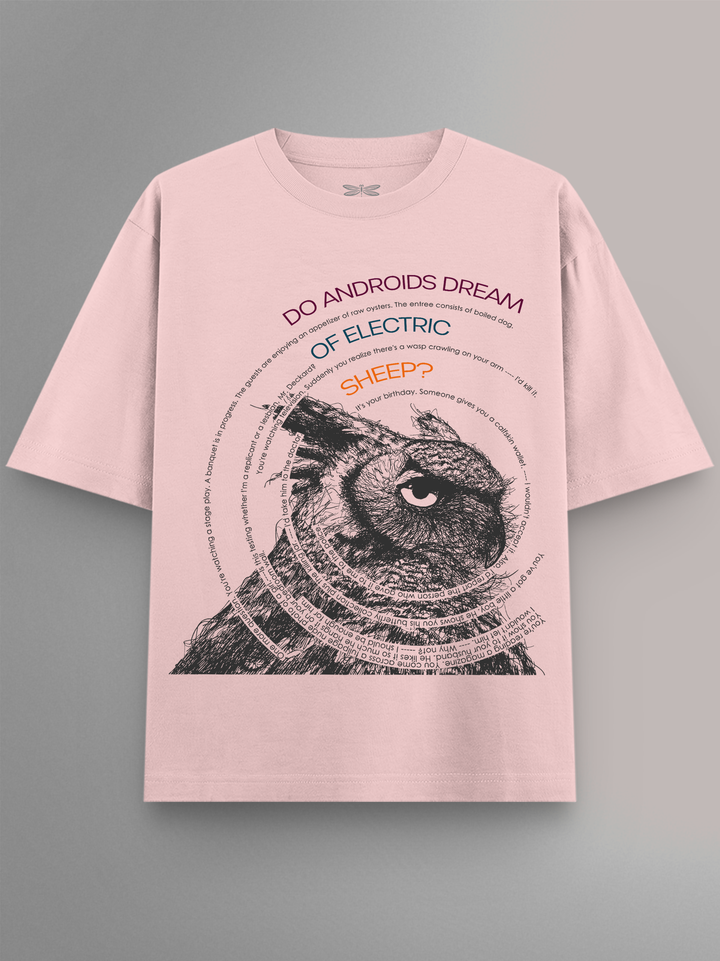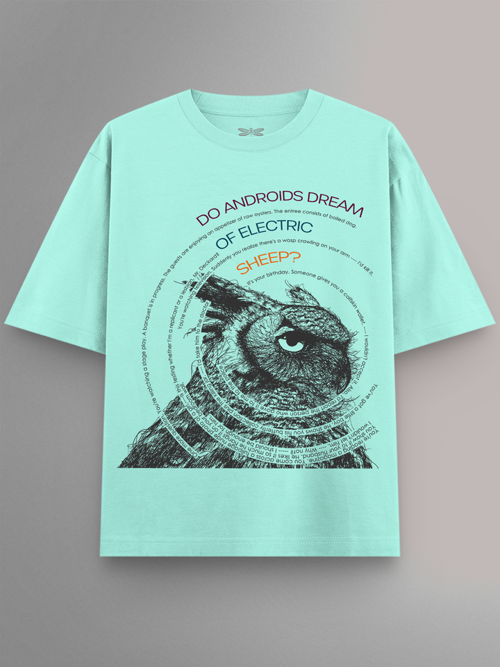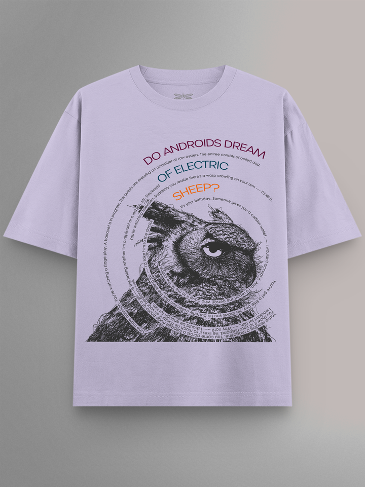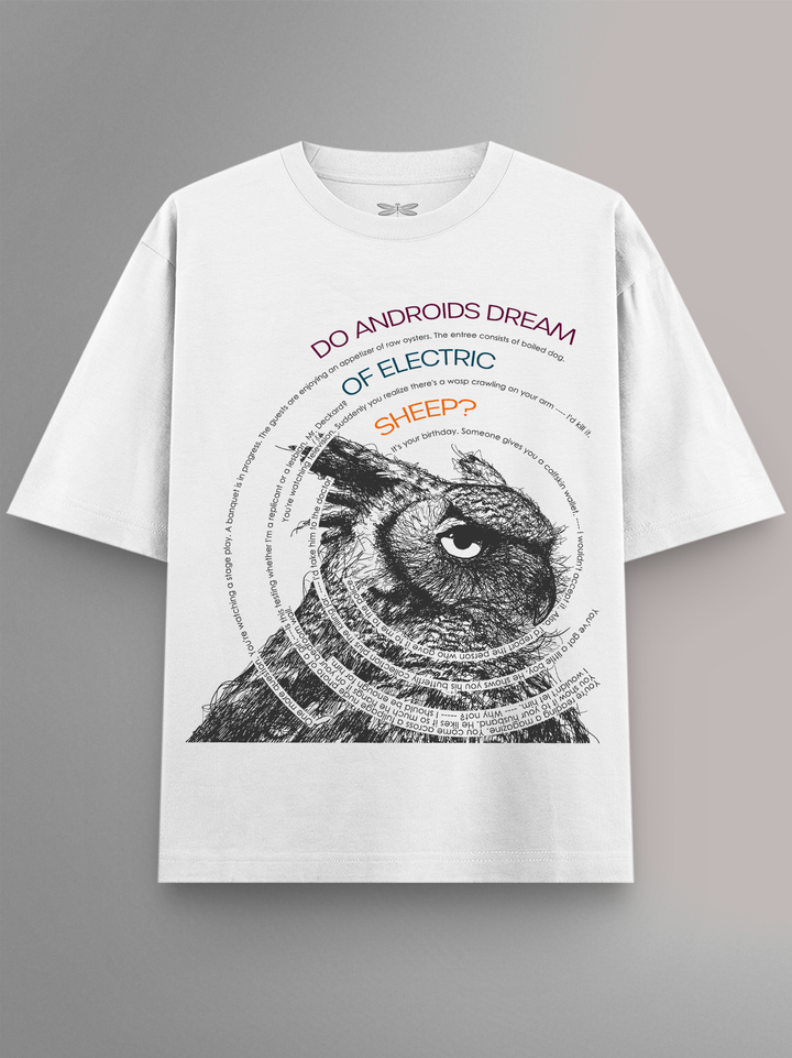 Product features a detailed black-ink owl, surrounded by spiraling text fragments lifted from Do Androids Dream of Electric Sheep? — surreal lines that blur the boundaries of empathy, identity, and artificial life. The title arcs across in fragmented color, mirroring the book’s dissonant tone. A cryptic tribute to Philip K. Dick’s layered dystopia. Part of the Counterculture Books Collection.