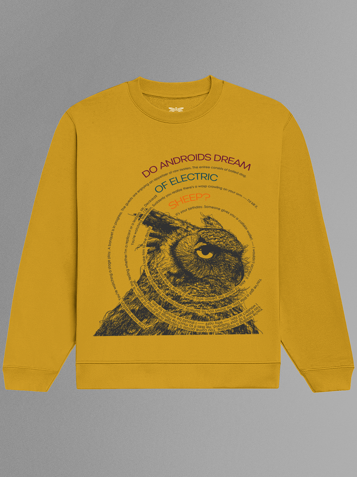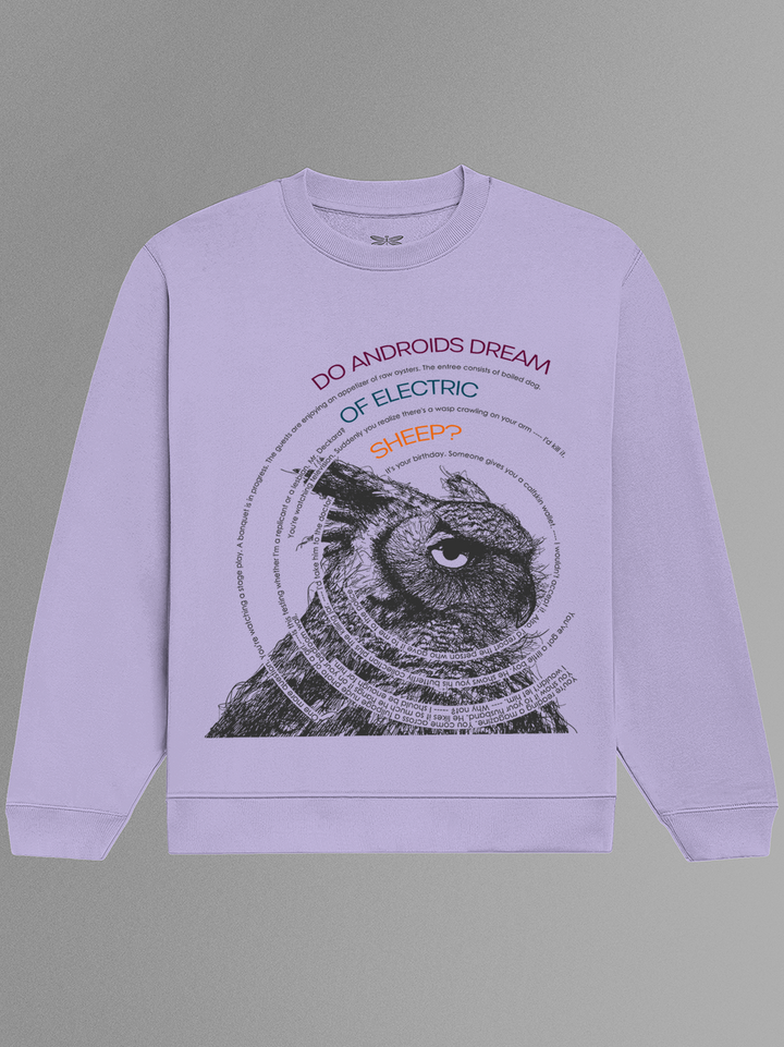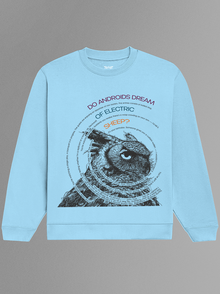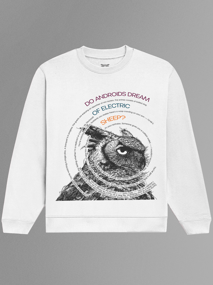 Product features a detailed black-ink owl, surrounded by spiraling text fragments lifted from Do Androids Dream of Electric Sheep? — surreal lines that blur the boundaries of empathy, identity, and artificial life. The title arcs across in fragmented color, mirroring the book’s dissonant tone. A cryptic tribute to Philip K. Dick’s layered dystopia. Part of the Counterculture Books Collection.