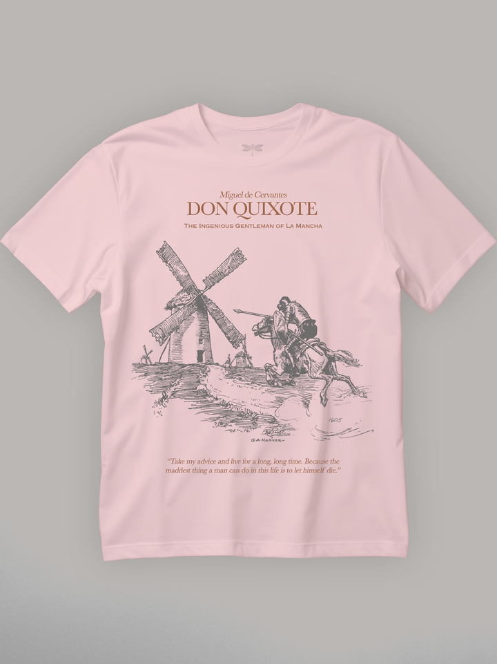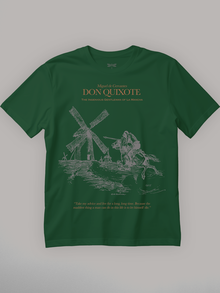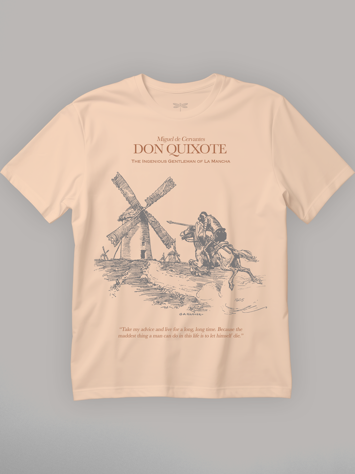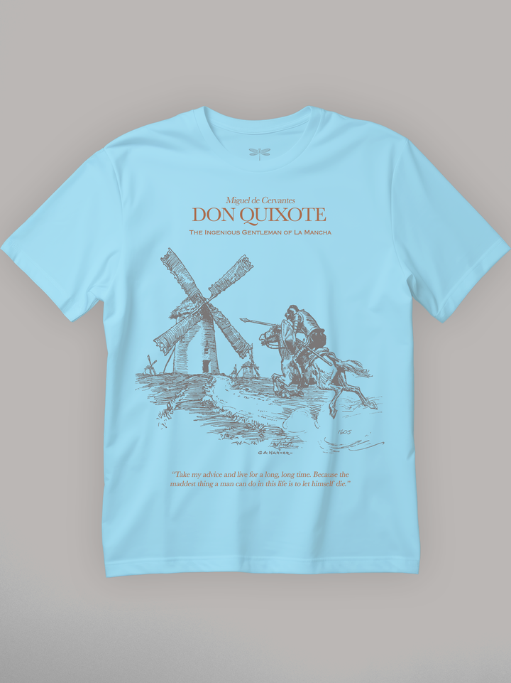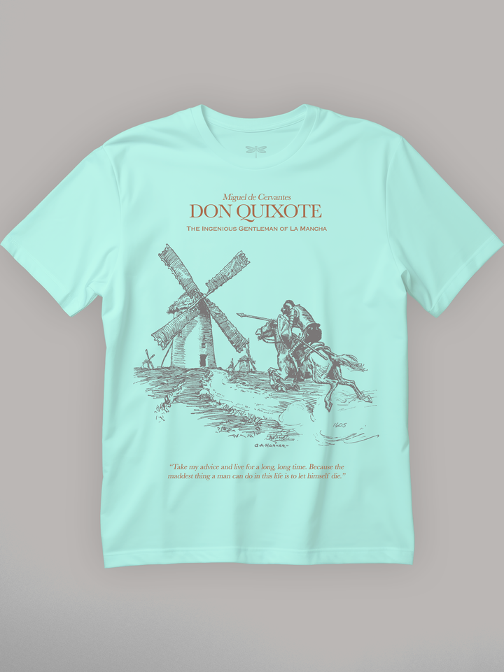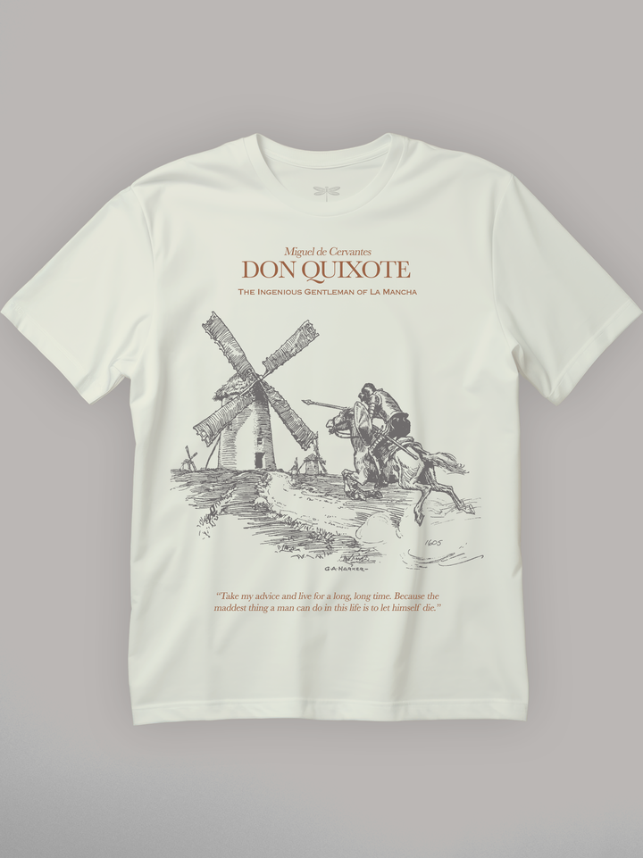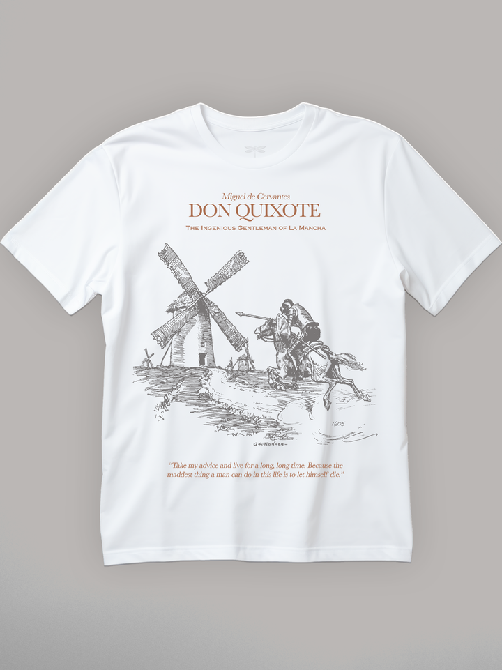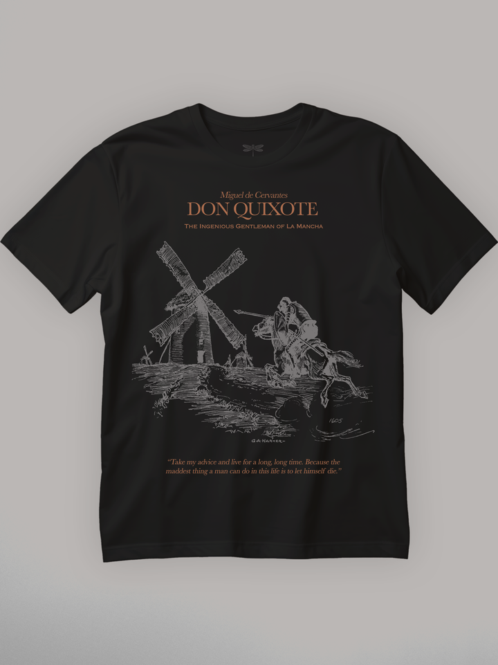 Product features Don Quixote (1605) by Miguel de Cervantes, known for pioneering the modern novel through its blend of satire and idealism. The story follows a dreamer who charges at windmills, mistaking them for giants — a lasting metaphor for conviction against illusion. The line “Take my advice and live for a long, long time. Because the maddest thing a man can do in this life is to let himself die.” captures Cervantes’ defiant philosophy of courageous folly. Part of the Counterculture Books Collection.
