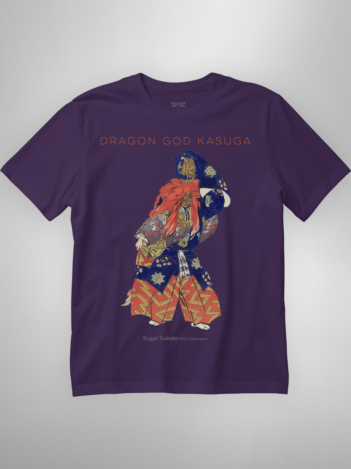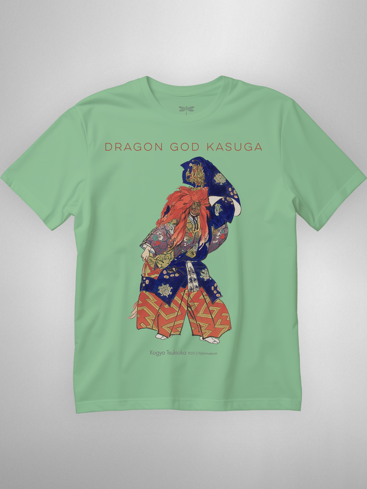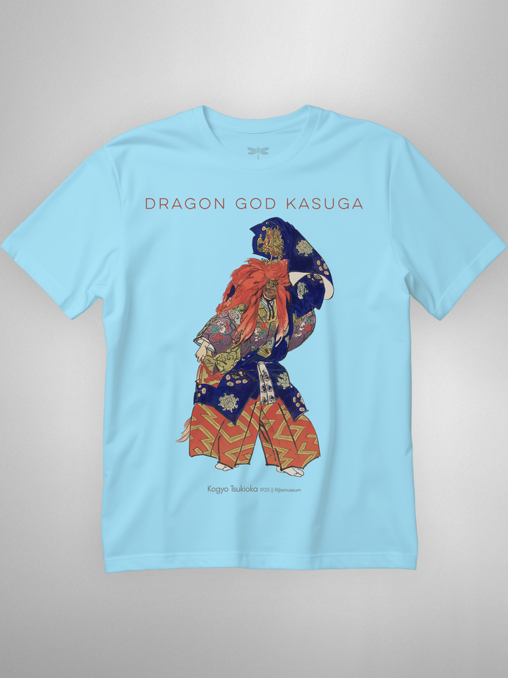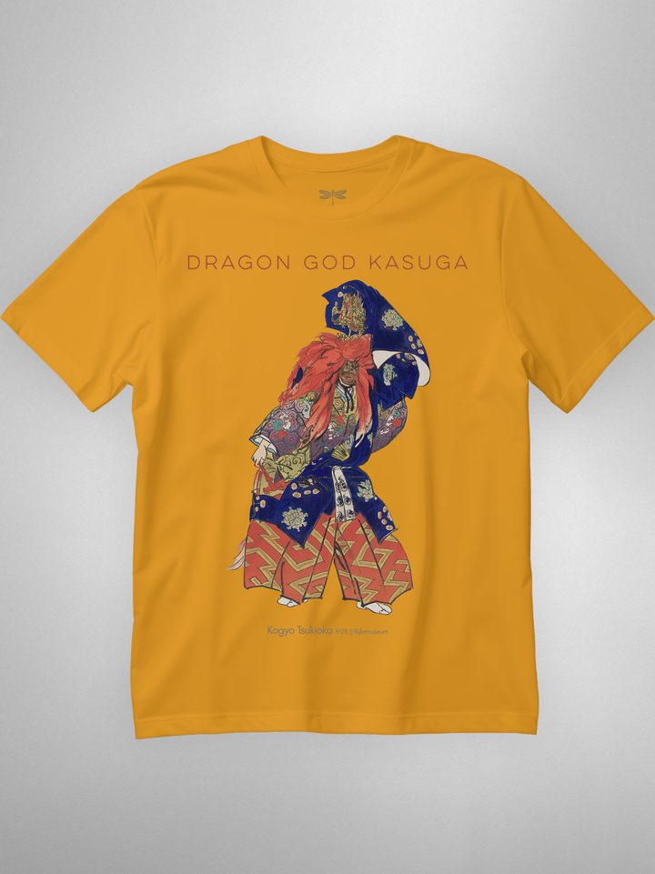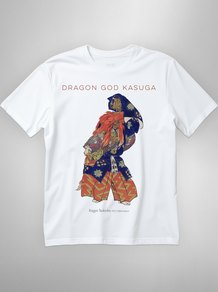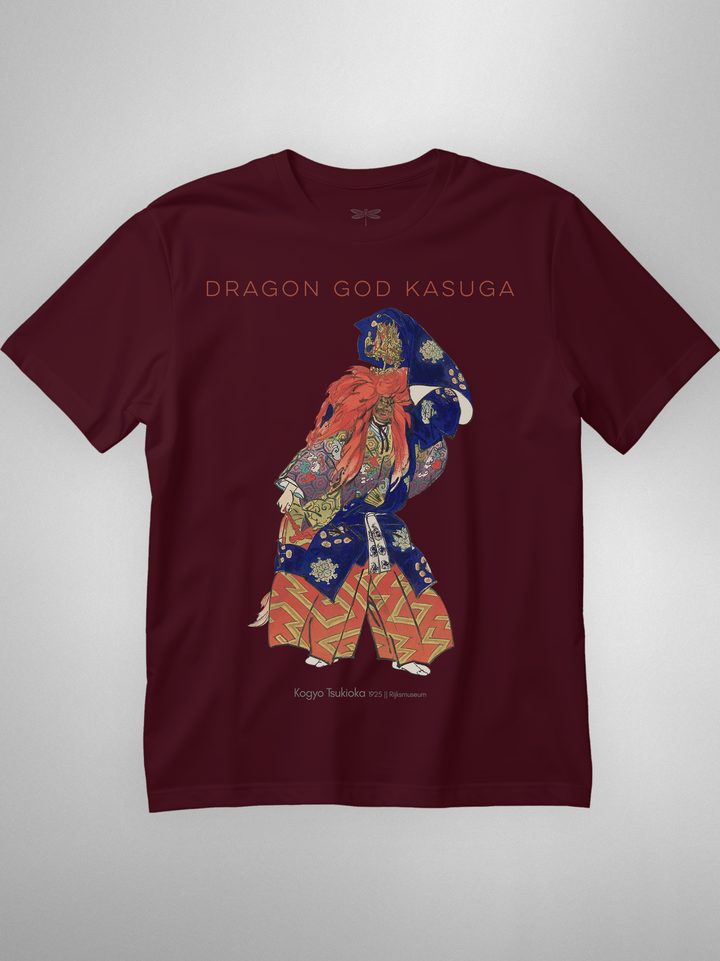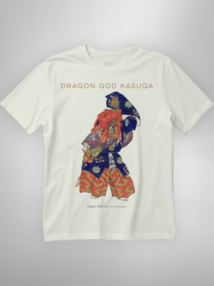 Product features Dragon God Kasuga (龍神春日) by Tsukioka Kōgyo, 1925. The print depicts a dramatic Noh theater figure, clad in patterned robes of red, blue, and gold, with a flowing mane of fiery hair. The dynamic stance and elaborate costume reflect the Ukiyo-e legacy carried into modern printmaking — where performance, costume, and myth converge in striking visual form.