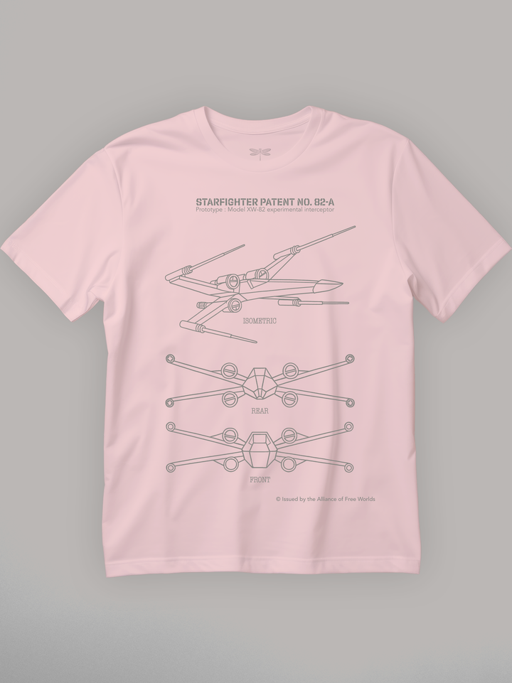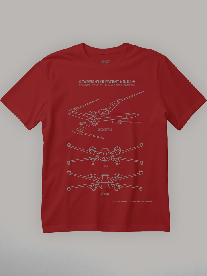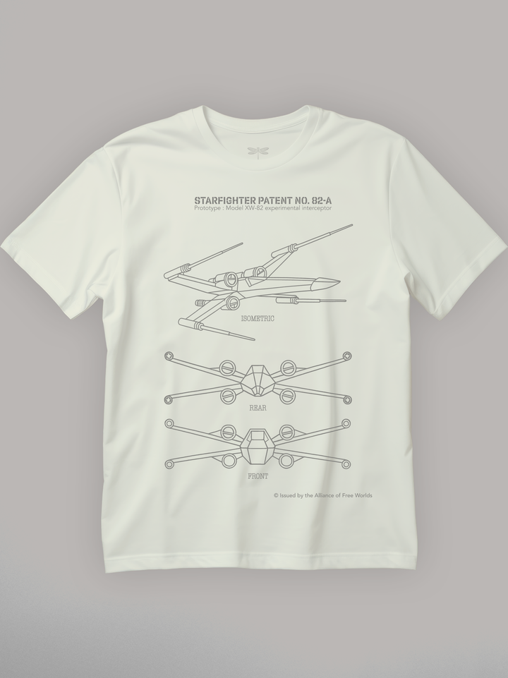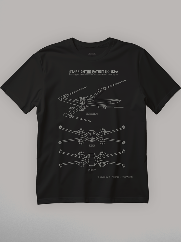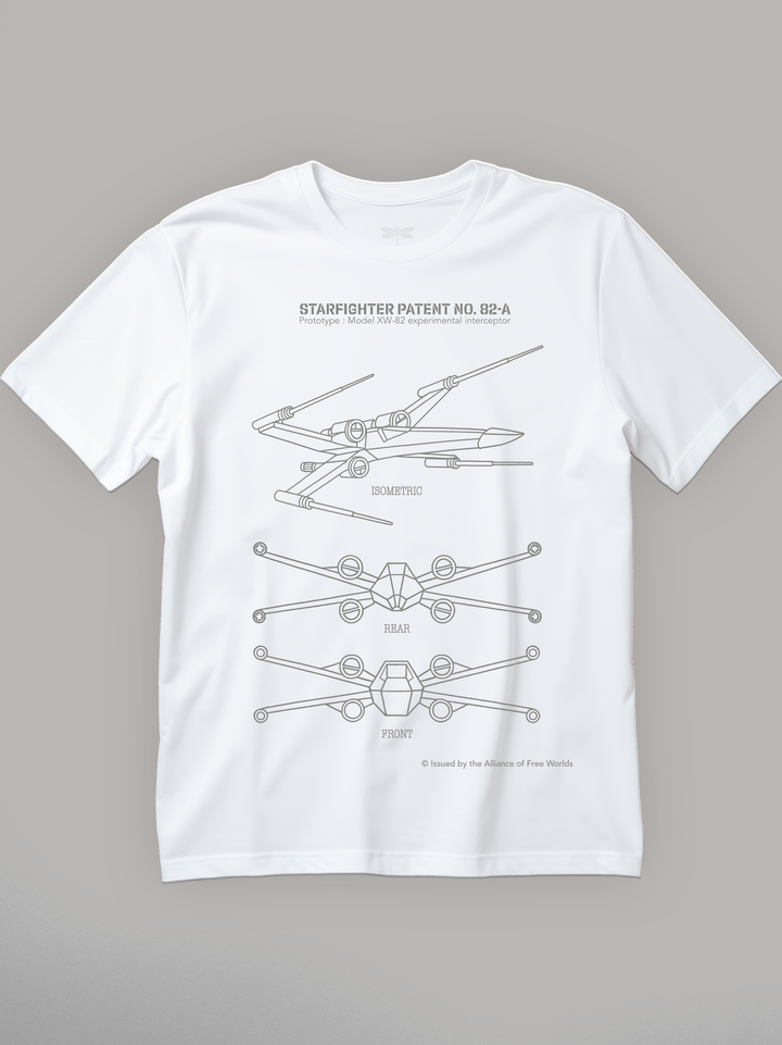 Product features a detailed starfighter blueprint inspired by the practical effects era of space cinema. Referencing the model sheets, technical drawings, and production archives that defined the genre, the artwork celebrates the craftsmanship behind on-screen imagination. A minimalist tribute to the films that turned engineering into storytelling and design into mythology. Part of the Cult Movies collection.