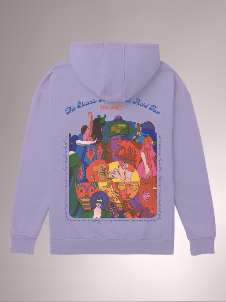 Product features a vivid, psychedelic collage of swirling figures, star-shaped sunglasses, and painted faces — capturing the chaotic energy of Tom Wolfe’s journey with Ken Kesey and the Merry Pranksters. Layered in saturated colors and warped outlines, the design mirrors the book’s acid-soaked ride through freedom, madness, and radical self-expression, framed by a looping quote about people living inside their own movies. Part of the Counterculture Books Collection.