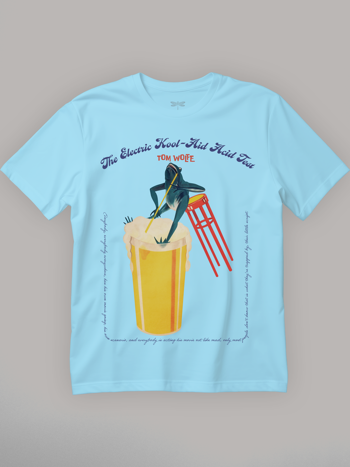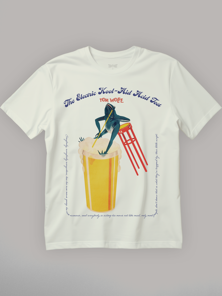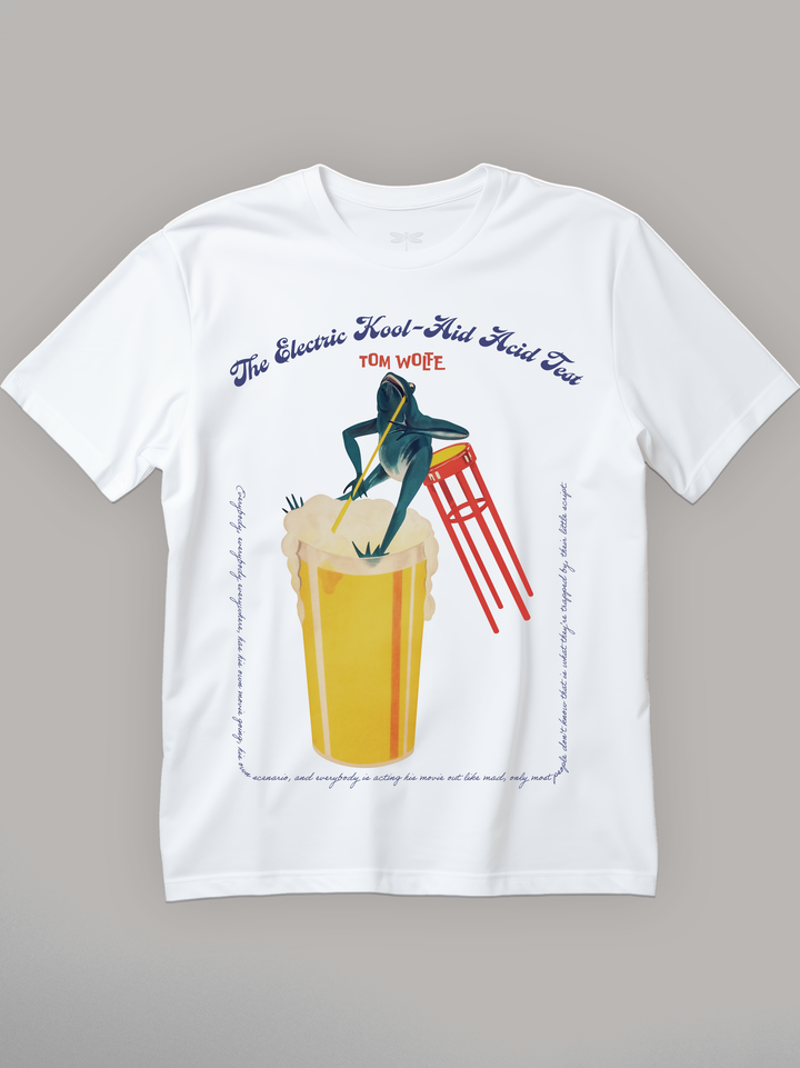 Product features a surreal reinterpretation of The Electric Kool-Aid Acid Test — a frog suspended mid-leap over a frothing glass, caught between absurdity and revelation. The imagery transforms Wolfe’s psychedelic odyssey into minimalist surrealism — bright, clean tones replacing chaos, yet the energy of disorientation and awakening remains. Surrounding text loops his iconic line about people living inside their own movies, grounding the design in its counterculture roots. Part of the Counterculture Books Collection.