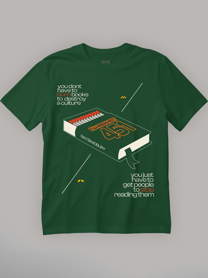 Product features a stylized book illustrated as a matchbox, complete with red-tipped matches, drawing from Ray Bradbury’s dystopian classic. The quote — “You don’t have to burn books to destroy a culture…” — wraps the design with quiet urgency. A stark, modernist tribute to censorship, complacency, and the slow death of curiosity. Part of the Counterculture Books Collection.