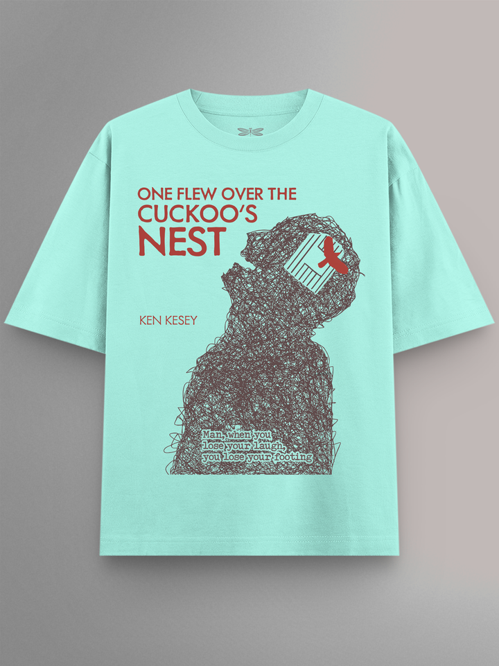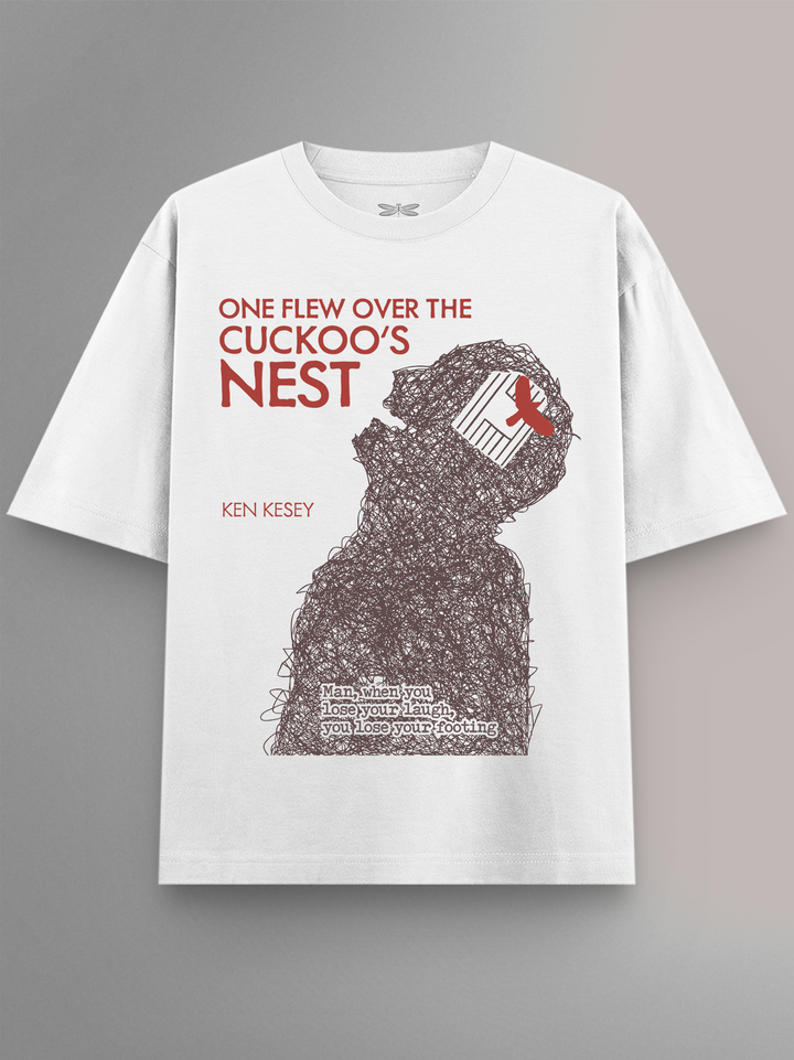 Product features a dense scribble-outline of a man’s silhouette, with a barred window and red bird embedded in the head — a striking visual of entrapment and imagined escape. Referencing Ken Kesey’s seminal novel on institutional control and rebellion, the rough linework mirrors the mental unraveling within the psychiatric ward. Finished with the quote, “Man, when you lose your laugh, you lose your footing,” the design is both chaotic and defiant. Part of the Counterculture Books Collection.