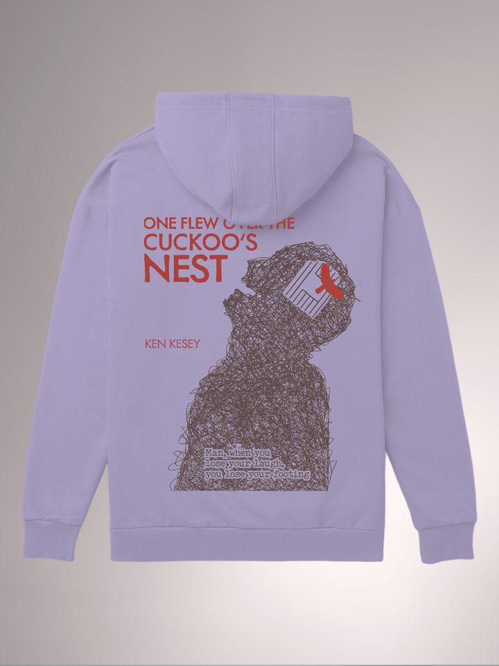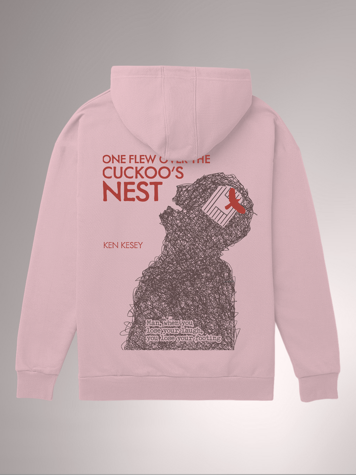 Product features a dense scribble-outline of a man’s silhouette, with a barred window and red bird embedded in the head — a striking visual of entrapment and imagined escape. Referencing Ken Kesey’s seminal novel on institutional control and rebellion, the rough linework mirrors the mental unraveling within the psychiatric ward. Finished with the quote, “Man, when you lose your laugh, you lose your footing,” the design is both chaotic and defiant. Part of the Counterculture Books Collection.