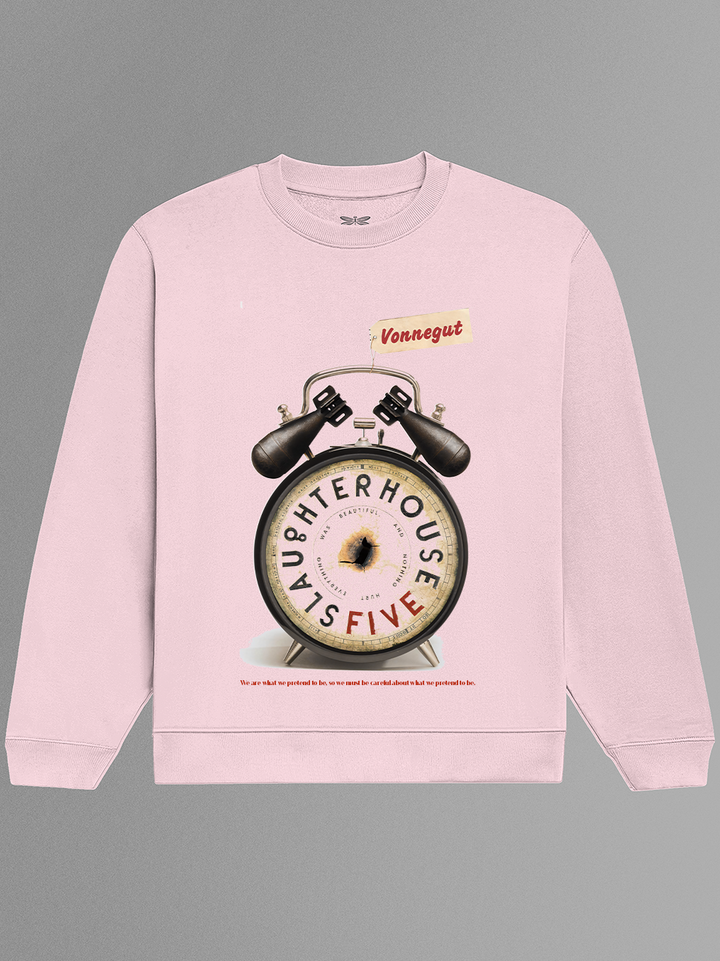 Product features a cracked, vintage alarm clock with its face blown open by a dark central impact — the numbers replaced by the novel’s circular title and phrases like “everything was beautiful, and nothing hurt.” Referencing Kurt Vonnegut’s time-bending anti-war classic, the design plays with the illusion of time as fixed and fractured, echoing the disorientation of trauma and memory. A quiet chaos rendered in cream, black, and red — all framed by Vonnegut’s signature fatalism. Part of the Counterculture Books Collection.