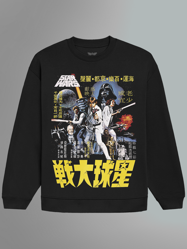 Product features the original Star Wars cast in a vintage Hong Kong-style movie poster, classic space opera explosions, and Darth Vader’s looming silhouette. A visual throwback to when Star Wars first hit global screens, this design channels pulp cinema flair with intergalactic rebellion. Part of the Cult Movies Collection.
