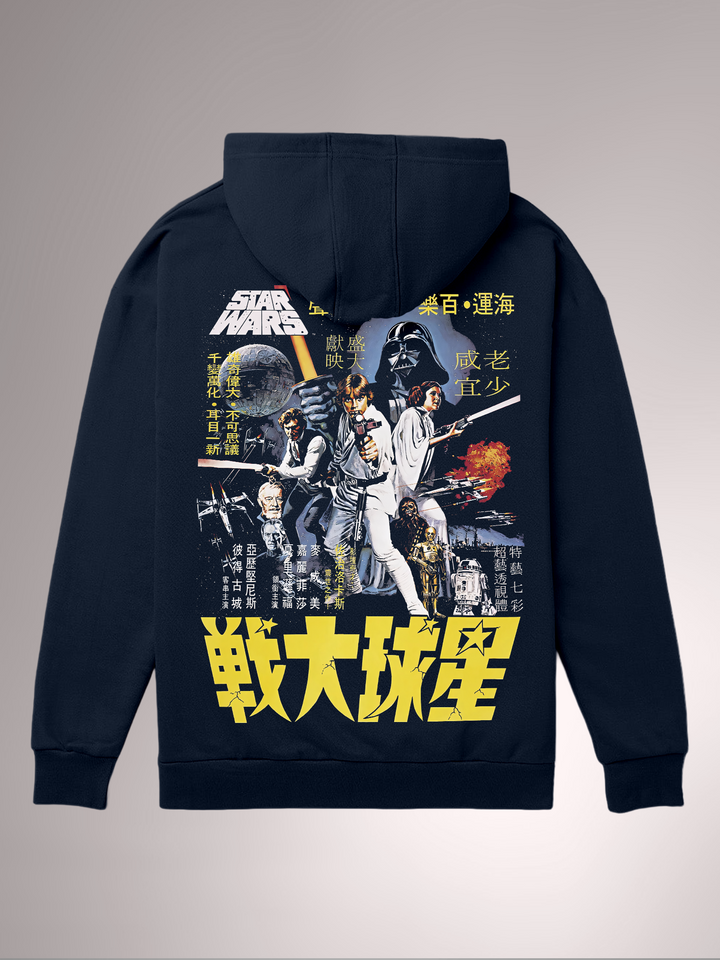 Product features the original Star Wars cast in a vintage Hong Kong-style movie poster, classic space opera explosions, and Darth Vader’s looming silhouette. A visual throwback to when Star Wars first hit global screens, this design channels pulp cinema flair with intergalactic rebellion. Part of the Cult Movies Collection.