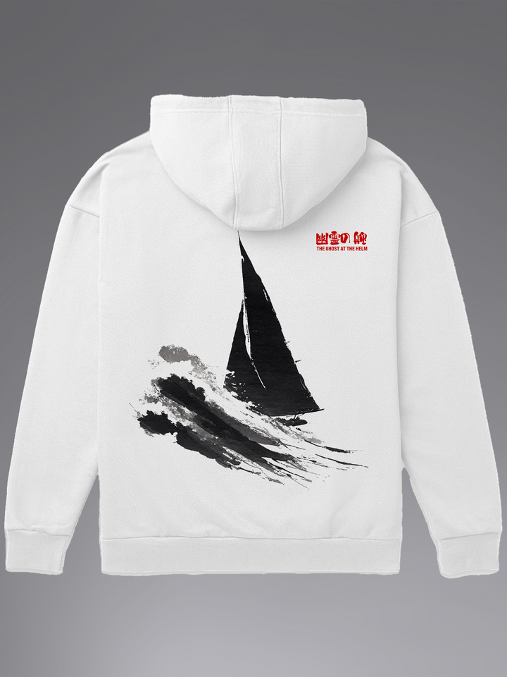 Product features a lone sailboat cutting through abstract Sumi-e waves, its black sail stark against the white canvas. The phrase “幽霊の舵” (The Ghost at the Helm) hints at unseen forces steering the journey — a metaphor for surrendering to instinct, fate, or the unknown. With bold brushstrokes that echo wind and water, this design captures the quiet drama of isolation and control. Part of the Sumi-e Collection.