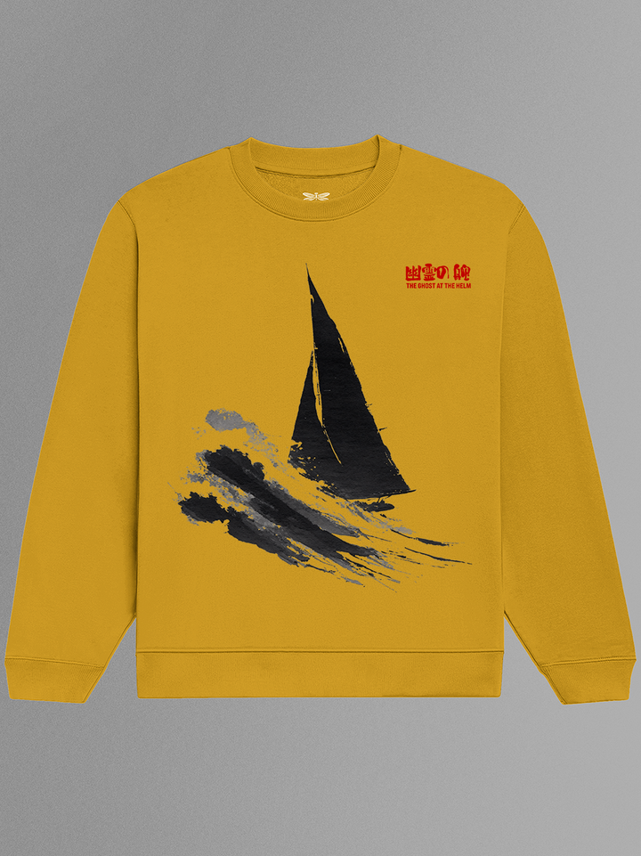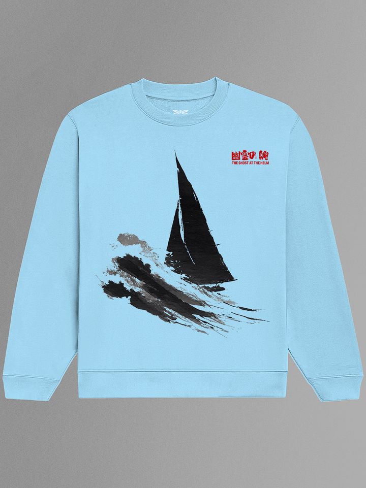 Product features a lone sailboat cutting through abstract Sumi-e waves, its black sail stark against the white canvas. The phrase “幽霊の舵” (The Ghost at the Helm) hints at unseen forces steering the journey — a metaphor for surrendering to instinct, fate, or the unknown. With bold brushstrokes that echo wind and water, this design captures the quiet drama of isolation and control. Part of the Sumi-e Collection.