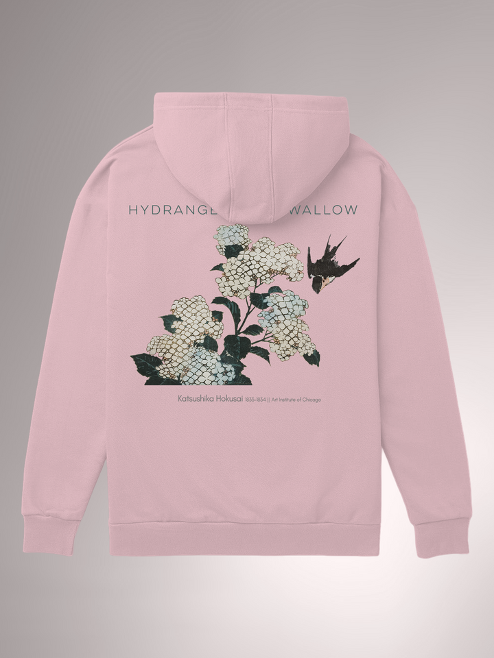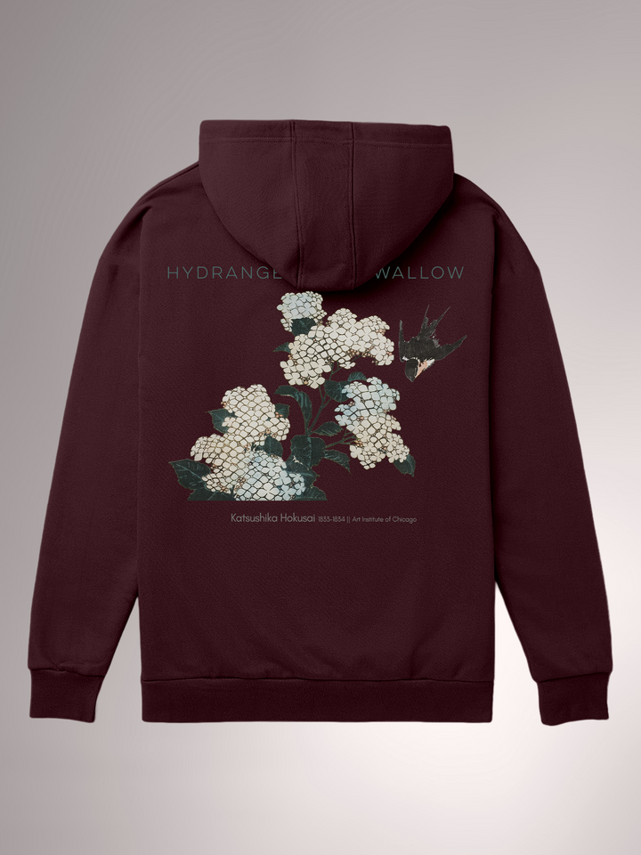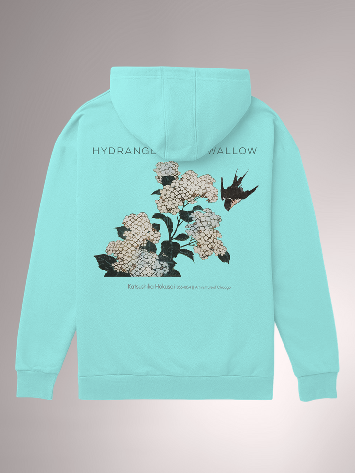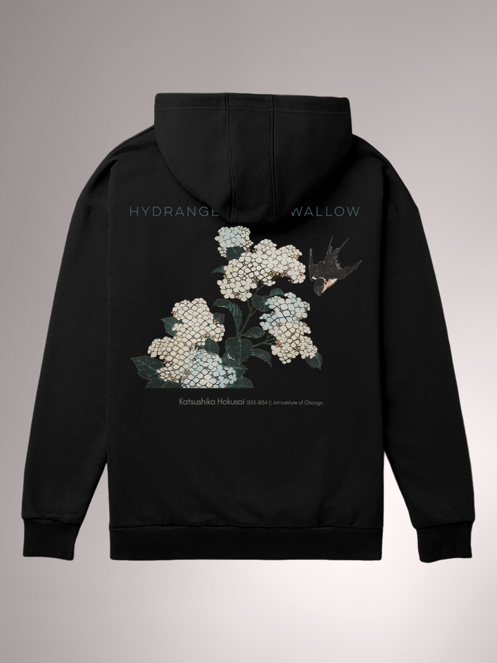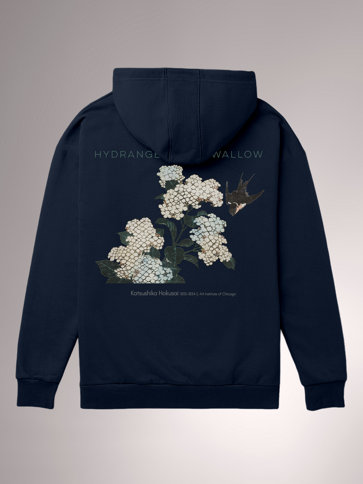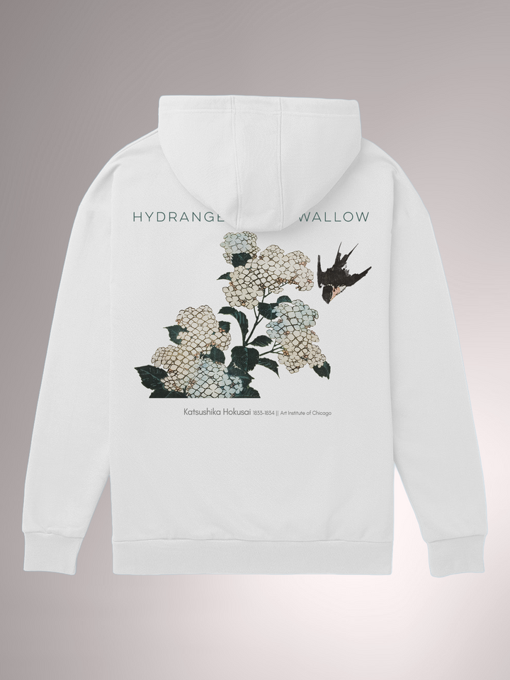 Product features Hydrangea and Swallow (紫陽花と燕) by Katsushika Hokusai, c. 1833–1834. The print captures clusters of white and pale-blue hydrangea blossoms, contrasted by the darting form of a swallow in flight. The delicate balance of stillness and motion embodies the Ukiyo-e tradition.