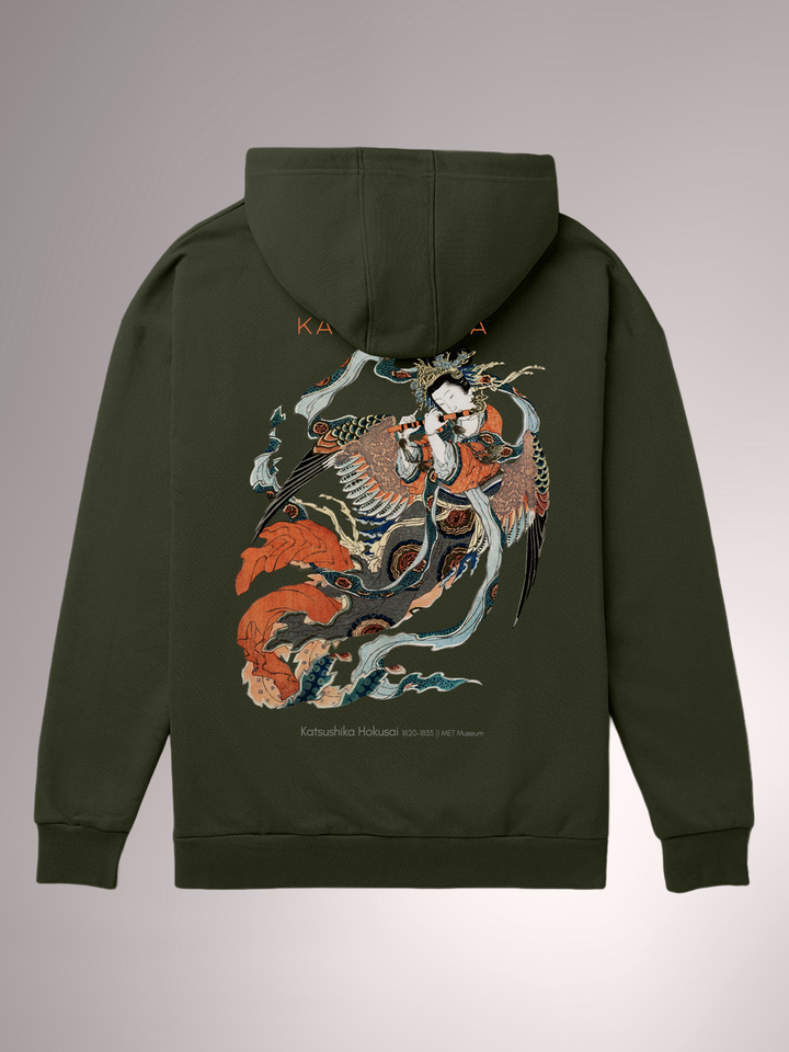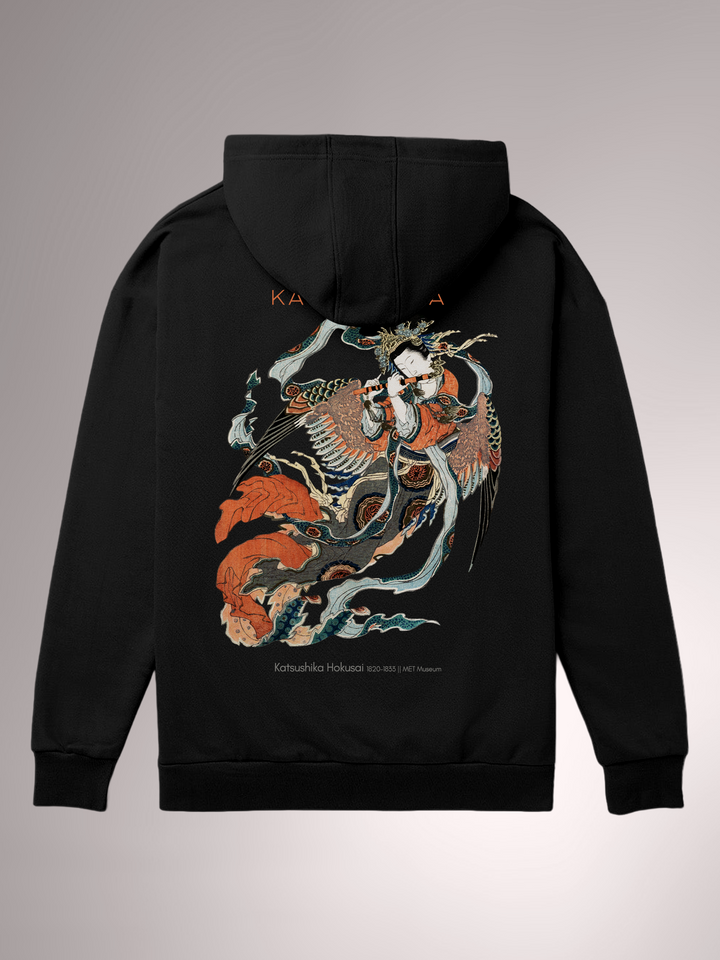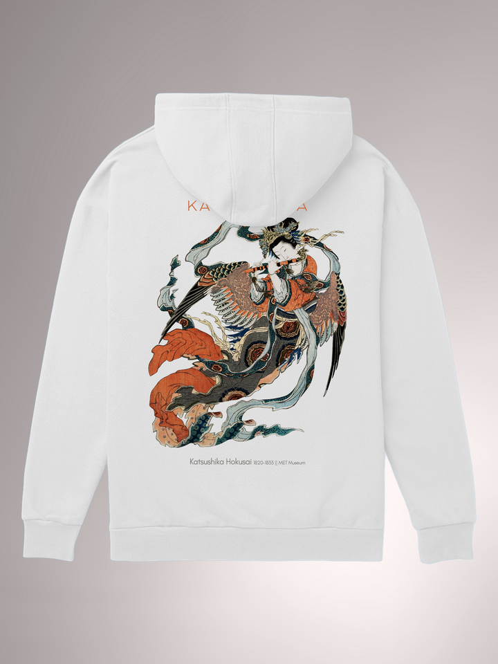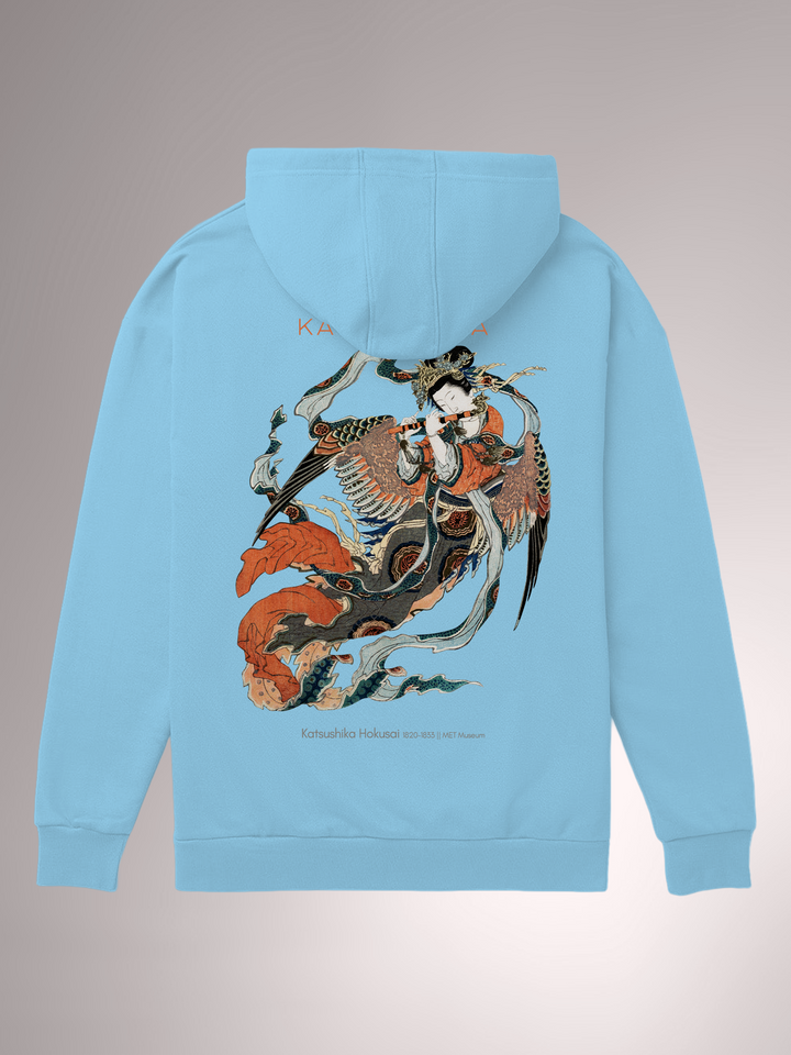 Ukiyo-e print of Karyōbinga (迦陵頻伽) by Hokusai, c. 1820–33. A celestial songbird from Buddhist lore—half bird, half human—revered for music “one never tires of hearing.” Rich surimono detailing (flowing robes, feathered wings, flute) gives the piece its ethereal motion and grace. (Karyōbinga = kalavinka, the heavenly musician.)
