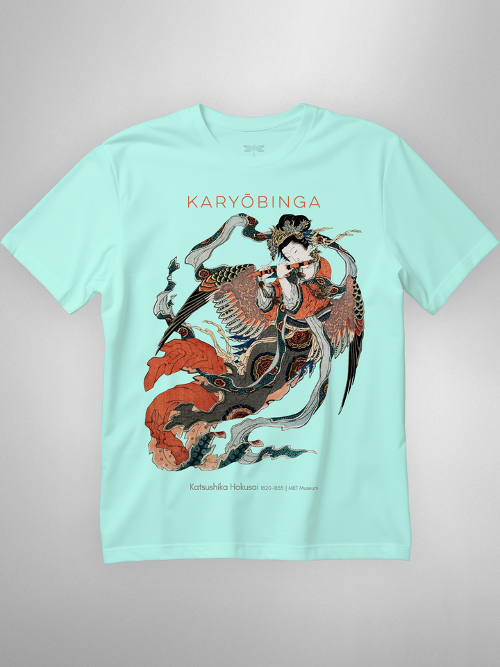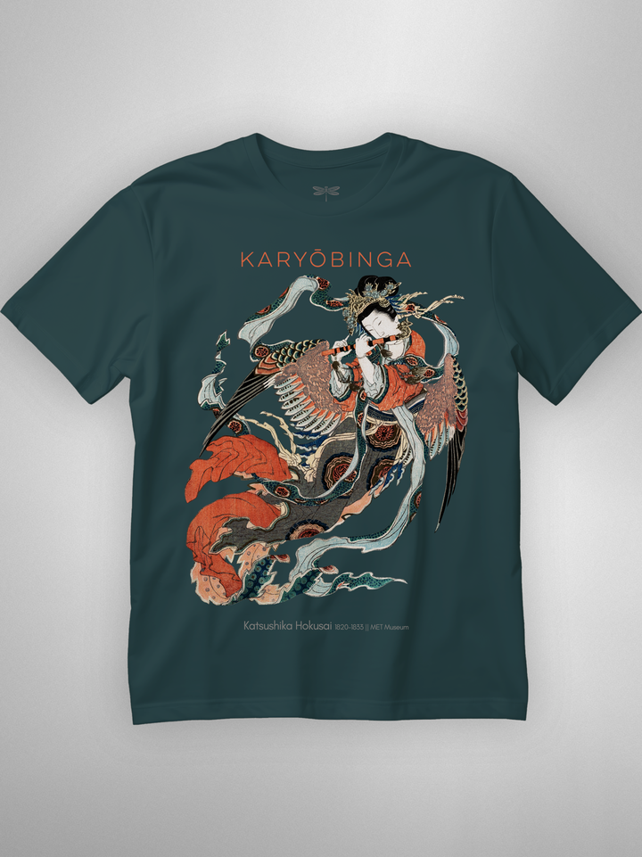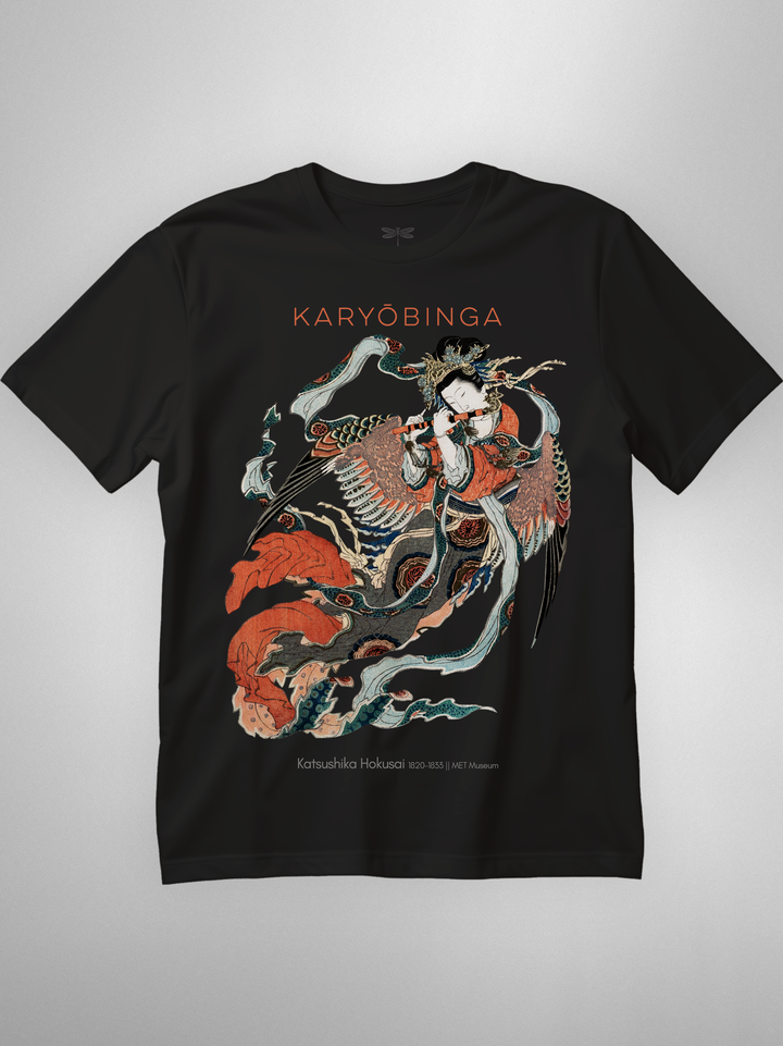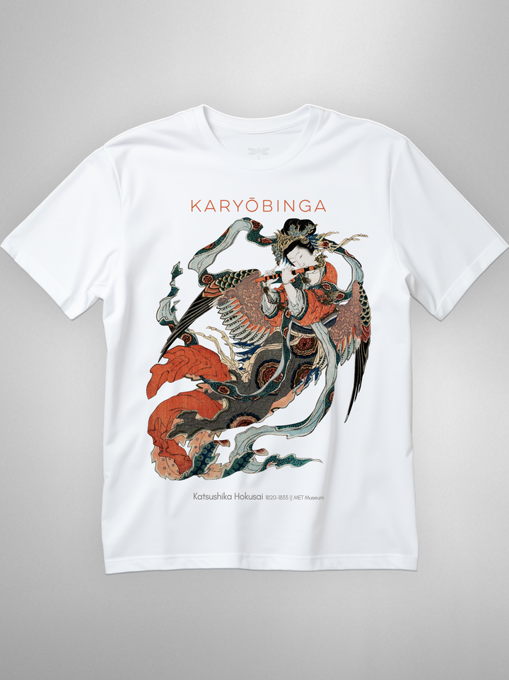 Ukiyo-e print of Karyōbinga (迦陵頻伽) by Hokusai, c. 1820–33. A celestial songbird from Buddhist lore—half bird, half human—revered for music “one never tires of hearing.” Rich surimono detailing (flowing robes, feathered wings, flute) gives the piece its ethereal motion and grace. (Karyōbinga = kalavinka, the heavenly musician.)
