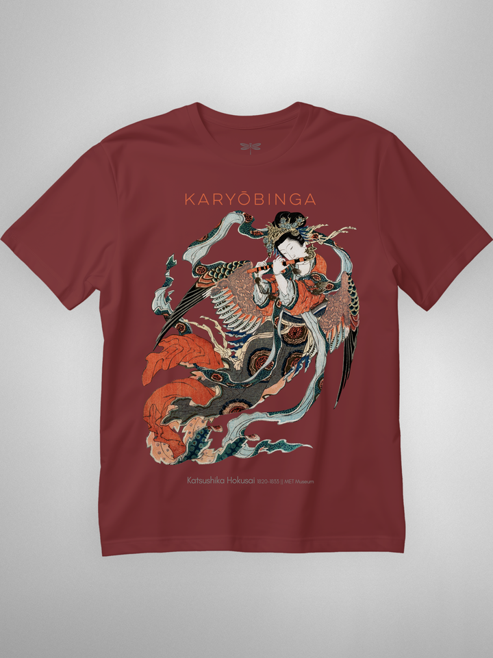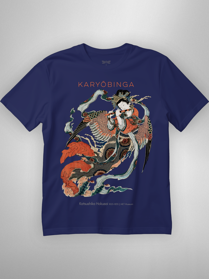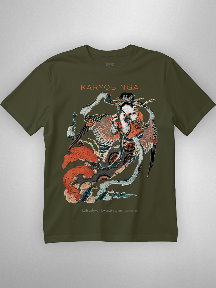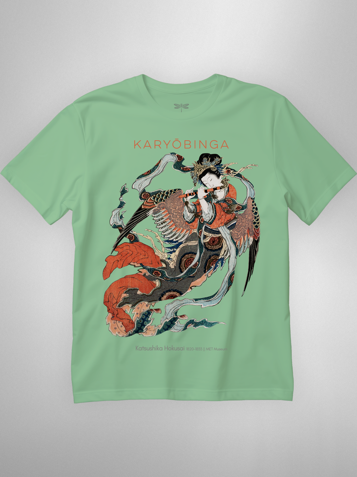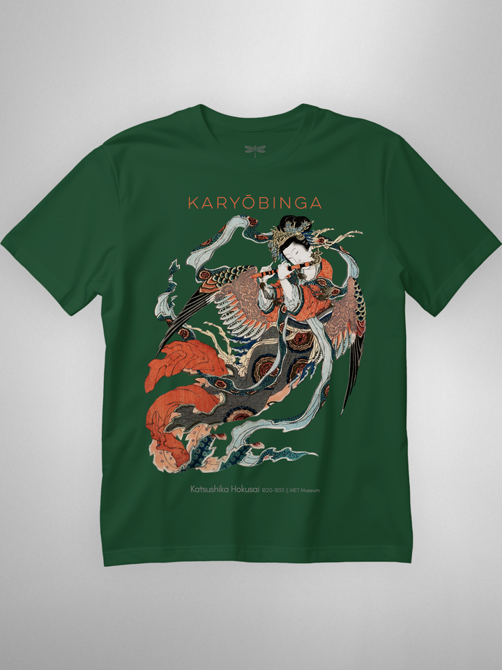 Ukiyo-e print of Karyōbinga (迦陵頻伽) by Hokusai, c. 1820–33. A celestial songbird from Buddhist lore—half bird, half human—revered for music “one never tires of hearing.” Rich surimono detailing (flowing robes, feathered wings, flute) gives the piece its ethereal motion and grace. (Karyōbinga = kalavinka, the heavenly musician.)