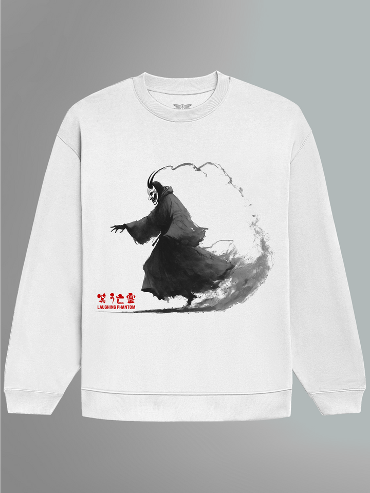 Product features a spectral figure cloaked in black ink, its mask twisted in a manic grin — a design inspired by tengu and Noh theatre spirits. The phrase “笑う亡霊” (Laughing Phantom) nods to Japan’s folklore of shape-shifting demons and trickster ghosts. Fading into smoke, the phantom seems to laugh at fear itself. Rendered in fluid sumi-e strokes, this piece dances between myth and madness. Part of the Sumi-e Collection.