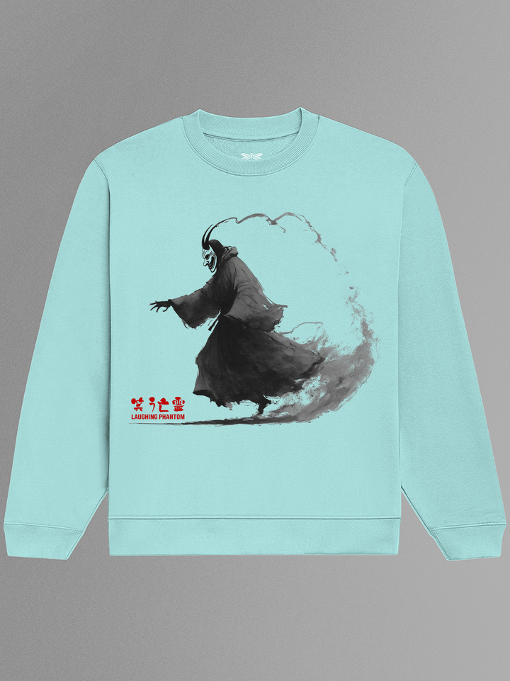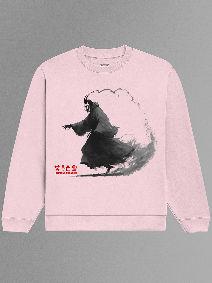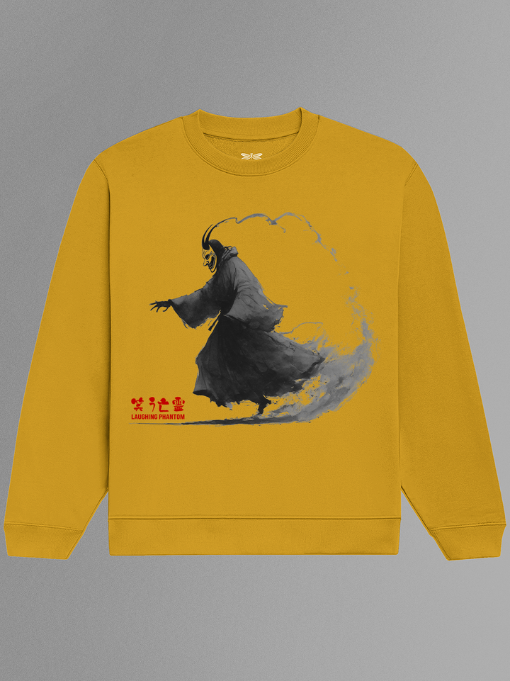 Product features a spectral figure cloaked in black ink, its mask twisted in a manic grin — a design inspired by tengu and Noh theatre spirits. The phrase “笑う亡霊” (Laughing Phantom) nods to Japan’s folklore of shape-shifting demons and trickster ghosts. Fading into smoke, the phantom seems to laugh at fear itself. Rendered in fluid sumi-e strokes, this piece dances between myth and madness. Part of the Sumi-e Collection.