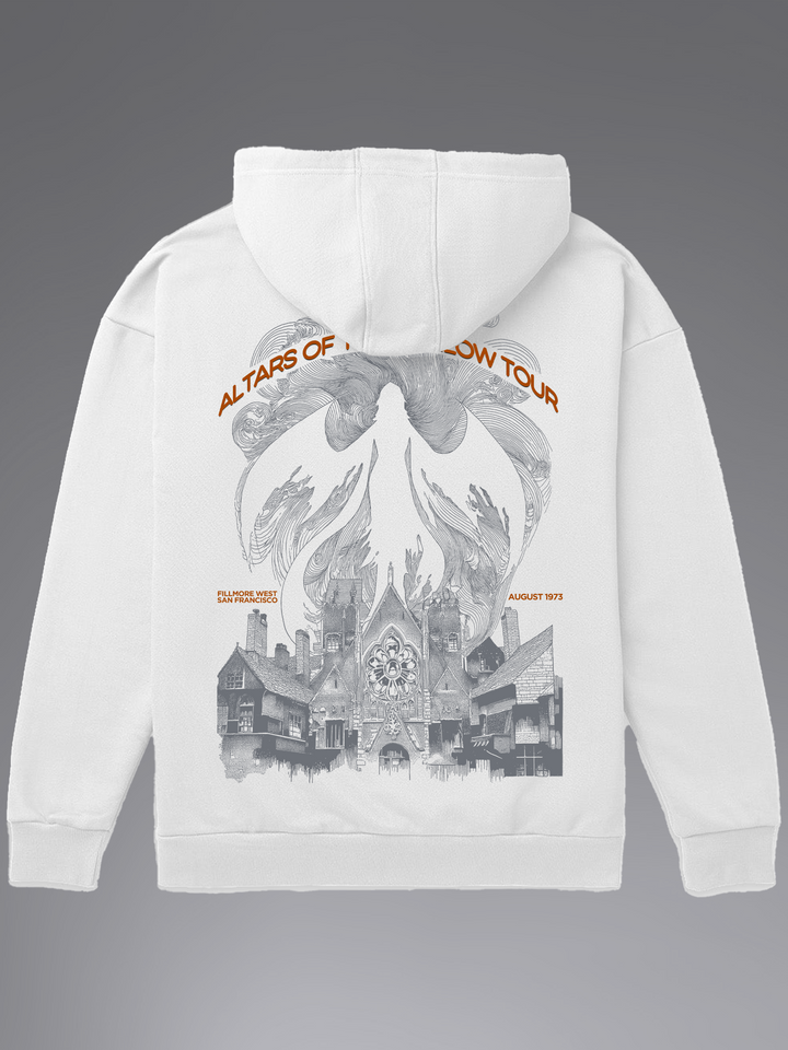 Product features a surreal fusion of gothic architecture and ethereal flame-like forms rising from within, evoking a sense of ritual, distortion, and reverence. Inspired by Led Zeppelin’s haunting stage presence and mythical tour visuals, this design channels the darker side of rock psychedelia. Part of the ’70's Rock' Collection.