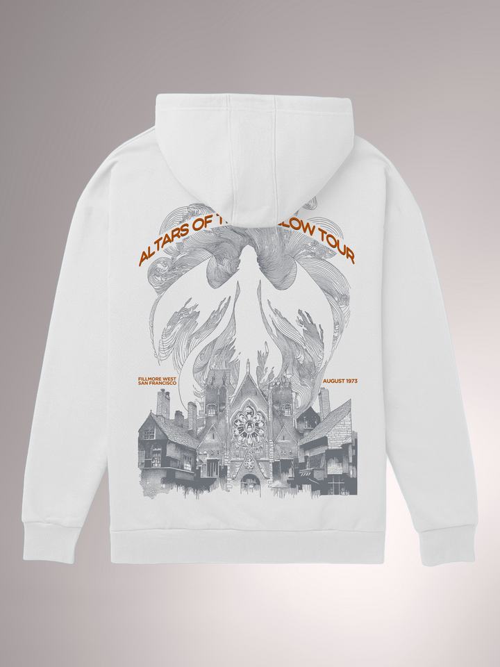 Product features a surreal fusion of gothic architecture and ethereal flame-like forms rising from within, evoking a sense of ritual, distortion, and reverence. Inspired by Led Zeppelin’s haunting stage presence and mythical tour visuals, this design channels the darker side of rock psychedelia. Part of the ’70's Rock' Collection.