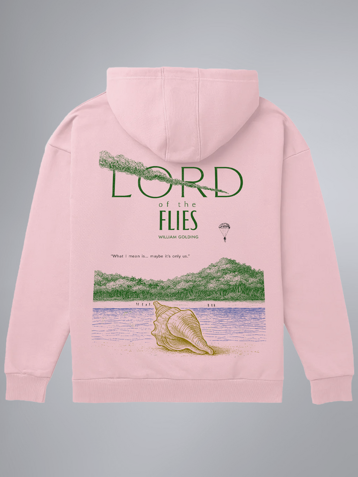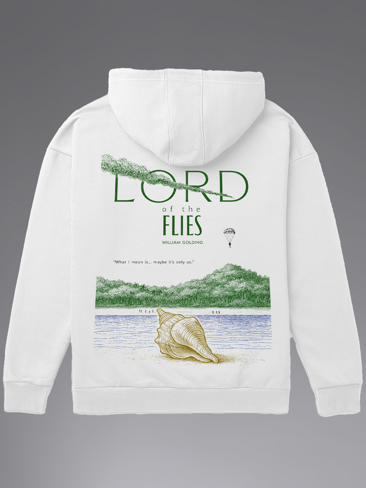 Product features a lone conch shell resting on a quiet shore, with dense jungle in the background and a smoke trail slashing the sky — a subtle nod to the plane crash. A drifting parachute and the quote “Maybe it’s only us” hint at the unraveling that follows. Inspired by Lord of the Flies, the design captures the novel’s slow descent from innocence to chaos — a study of human nature stripped bare. Part of the Counterculture Books Collection.