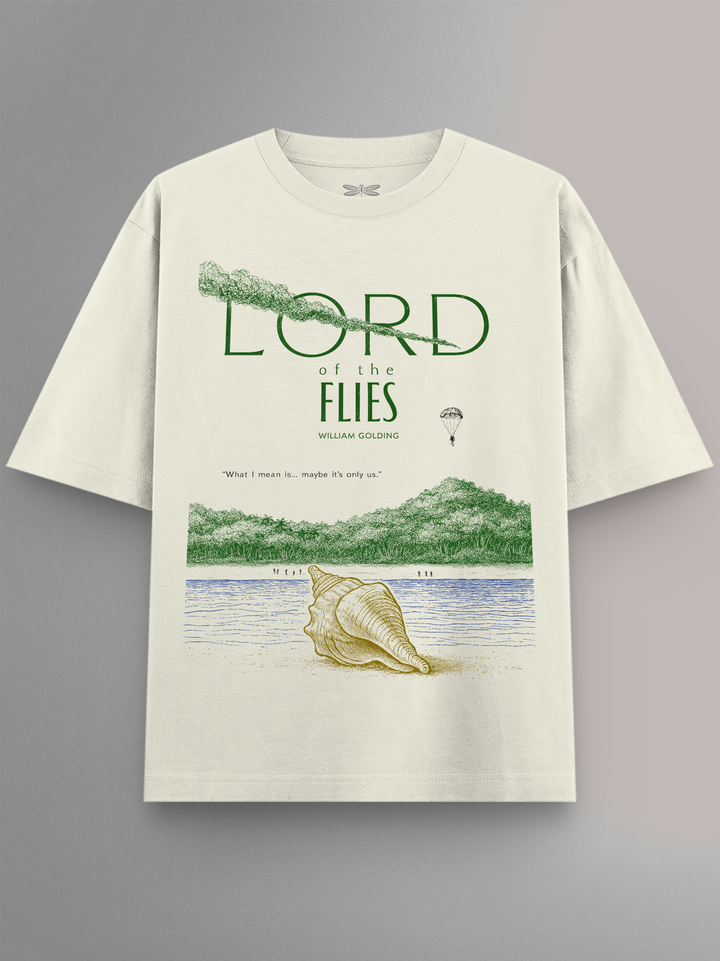 Product features a lone conch shell resting on a quiet shore, with dense jungle in the background and a smoke trail slashing the sky — a subtle nod to the plane crash. A drifting parachute and the quote “Maybe it’s only us” hint at the unraveling that follows. Inspired by Lord of the Flies, the design captures the novel’s slow descent from innocence to chaos — a study of human nature stripped bare. Part of the Counterculture Books Collection.