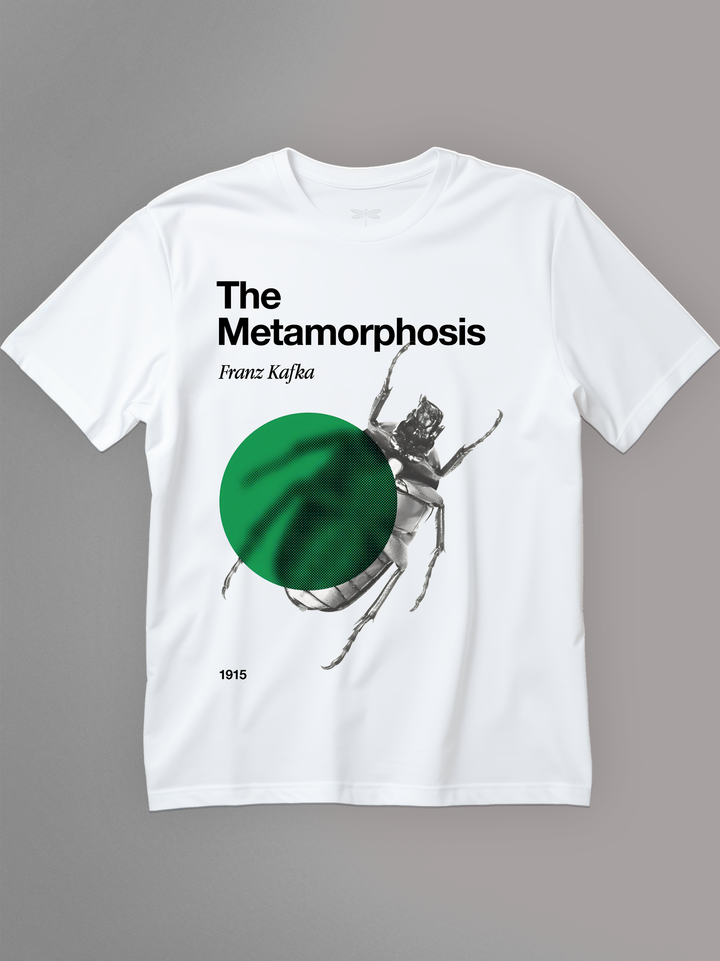 Product features a stark monochrome insect—legs raised mid-flail—partially obscured by a solid green circle that distorts and conceals. Referencing Kafka’s The Metamorphosis, the design channels the unease of Gregor Samsa’s transformation, blending clinical minimalism with surreal tension. A quiet nod to alienation, identity collapse, and the grotesque in the everyday. Part of the Counterculture Books Collection.
