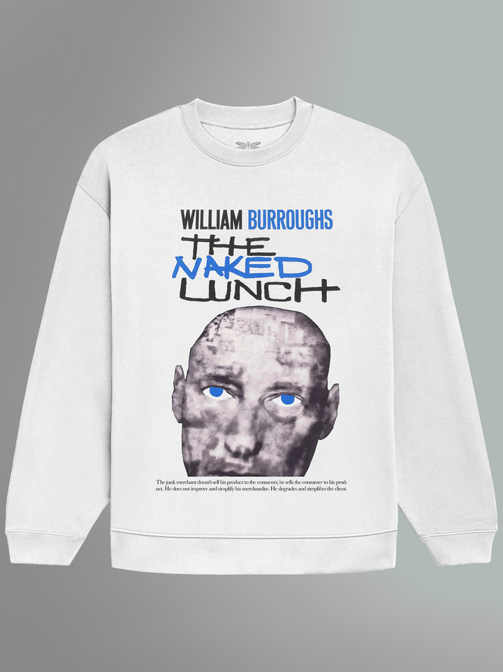 Product features a grainy grayscale face with hollow expression and unnaturally vivid blue eyes — a haunting image of disintegration. Referencing William S. Burroughs’ hallucinatory cult novel, the design captures the breakdown of self under systems of control, addiction, and consumer manipulation. The quote beneath — “He degrades and simplifies the client” — echoes Burroughs’ brutal take on commodified existence. Part of the Counterculture Books Collection.