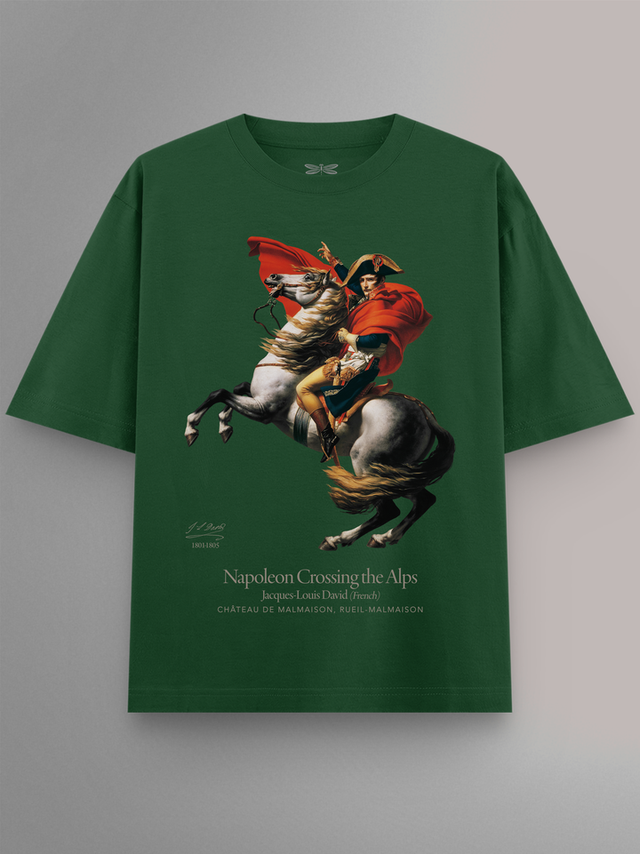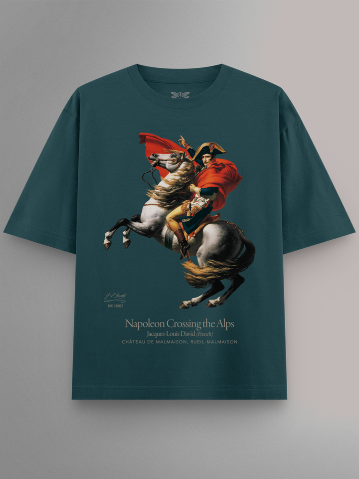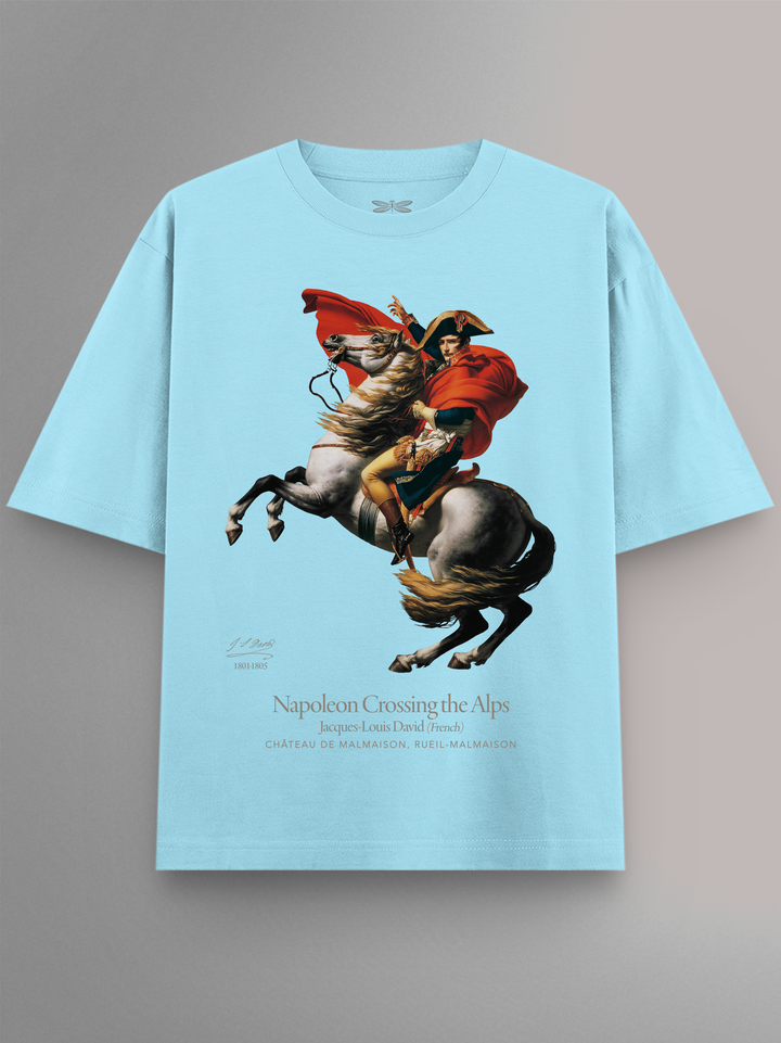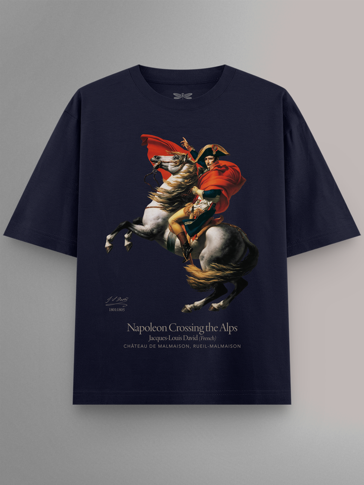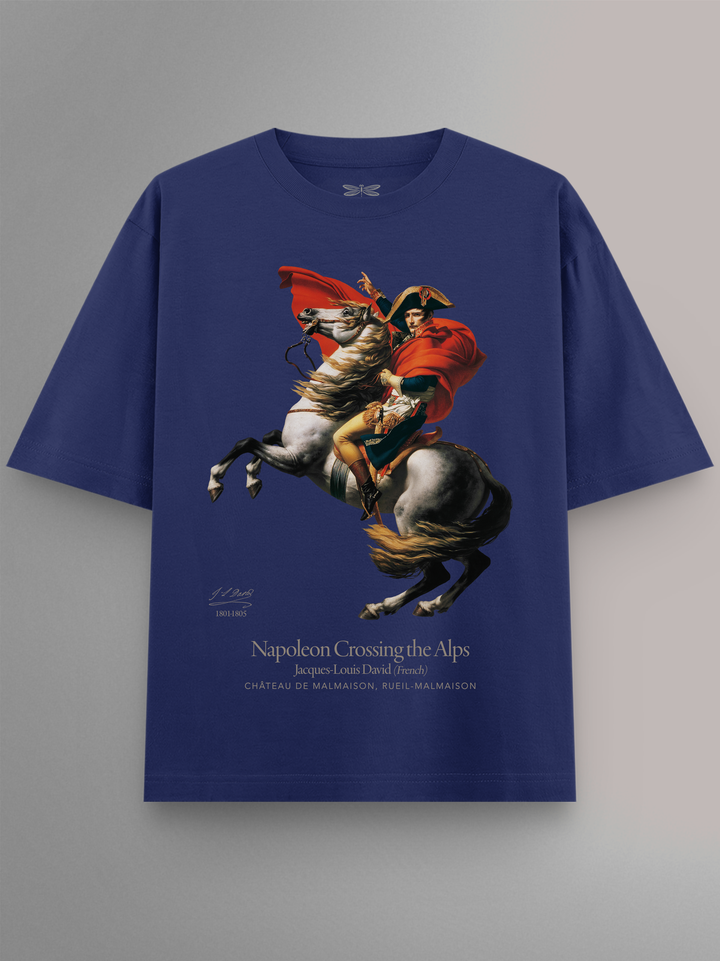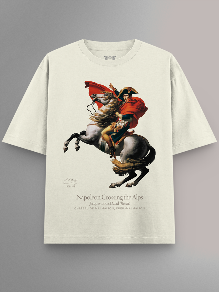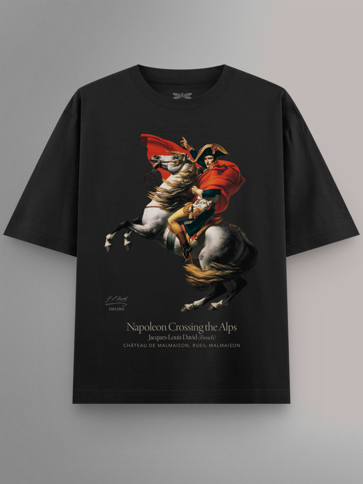 Product features Napoleon Crossing the Alps (1801–1805) by Jacques-Louis David, known for his grand neoclassical style and mastery of heroic composition. Commissioned by Napoleon himself, this painting reimagines his 1800 Alpine crossing with idealized drama — calm expression, rearing stallion, and wind-swept cloak turning history into legend. Few realize David created five versions of this work, each gifted to different European courts as political propaganda. Housed in the Château de Malmaison, Rueil-Malmaison. Part of the Art Movement Collection.