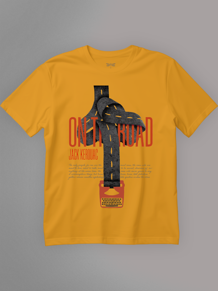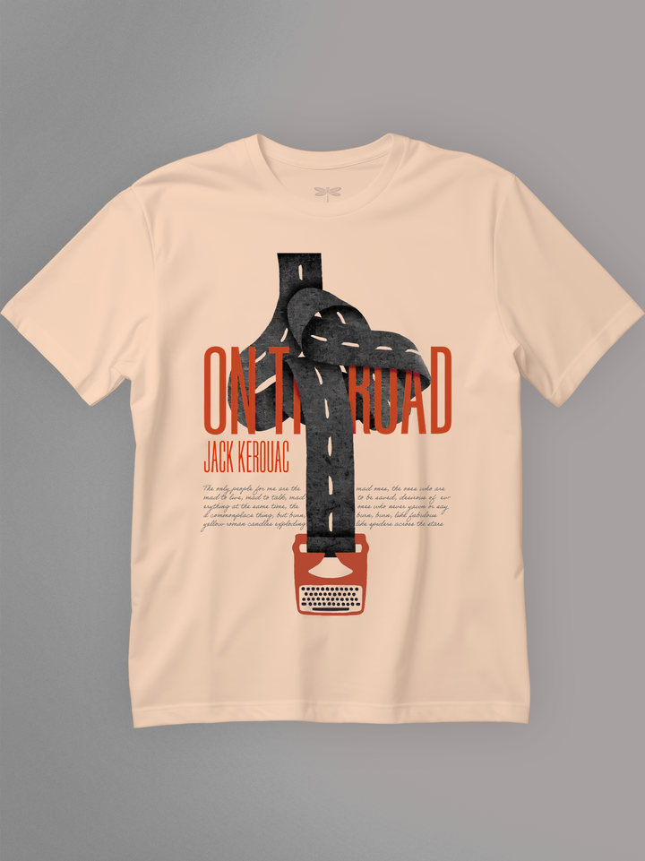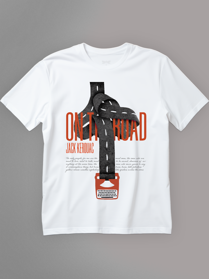 Product features a looping, ink-black highway unraveling from a vintage reddish typewriter — a visual fusion of movement and mania that captures the core of Jack Kerouac’s stream-of-consciousness classic. The title cuts across the road in bold orange, while the quote below celebrates the “mad ones” who burn bright and never slow down. A restless tribute to jazz, freedom, and the poetry of motion. Part of the Counterculture Books Collection.