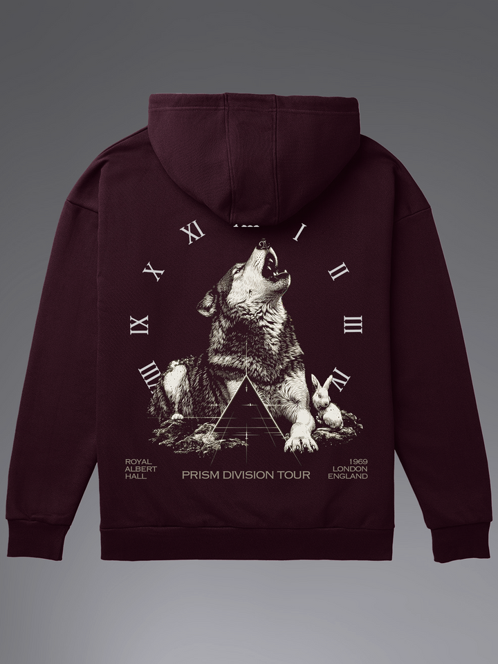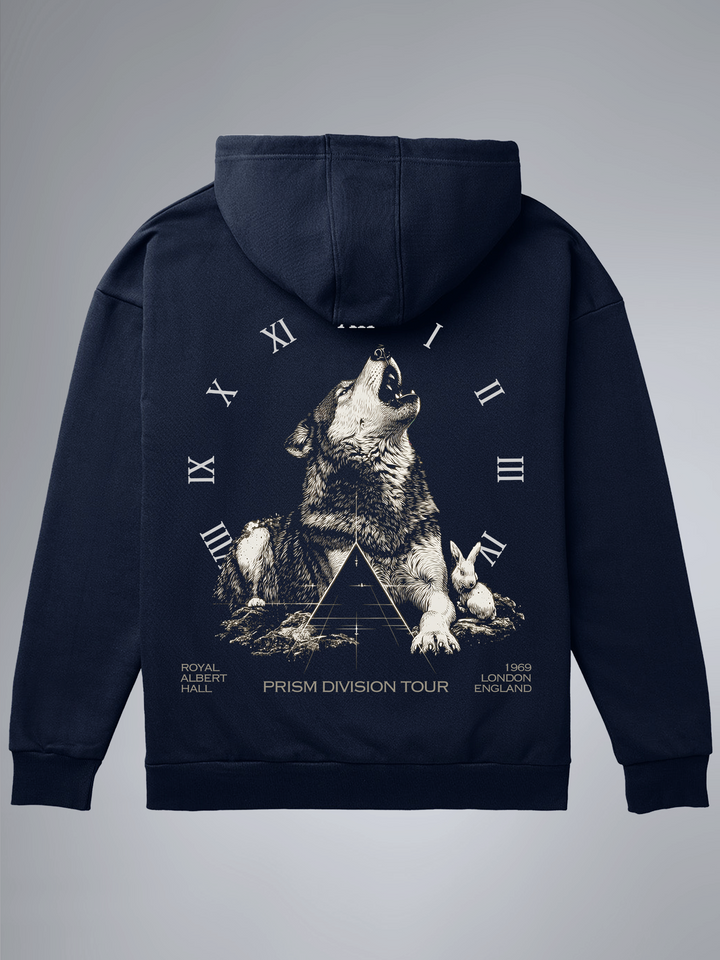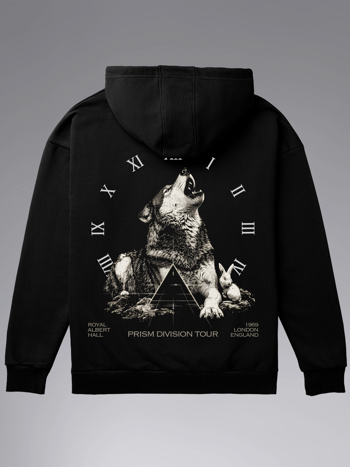 Product features a surreal composition of a wolf howling beneath a prism beam, framed by Roman numerals and accompanied by a serene rabbit. Inspired by Pink Floyd’s performance at the Royal Albert Hall in 1969, this design merges natural mysticism with geometric abstraction. Part of the '60's Rock' Collection.