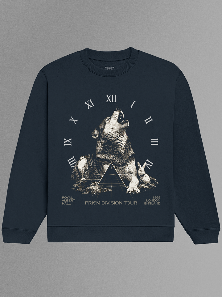 Product features a surreal composition of a wolf howling beneath a prism beam, framed by Roman numerals and accompanied by a serene rabbit. Inspired by Pink Floyd’s performance at the Royal Albert Hall in 1969, this design merges natural mysticism with geometric abstraction. Part of the '60's Rock' Collection.