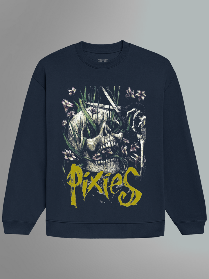 Product features a decayed skull intertwined with blooming flowers, symbolizing the Pixies' raw, surreal aesthetic and their ability to blend darkness with bursts of life. Part of the '90s Rock Collection'.