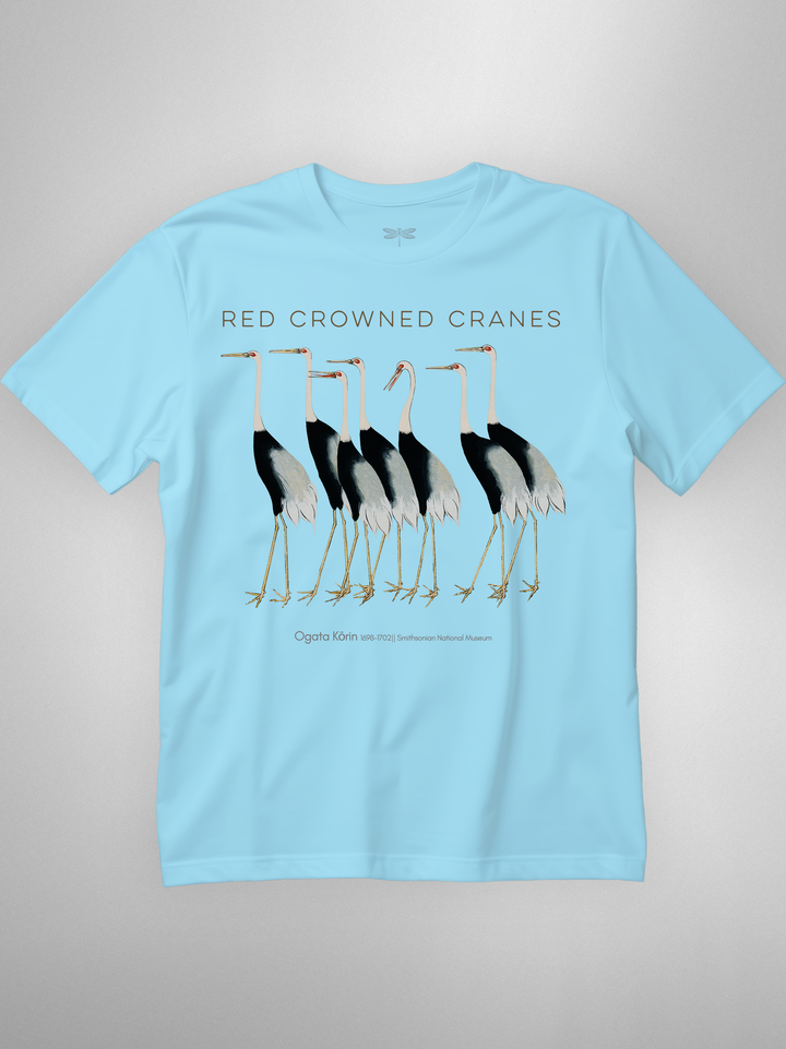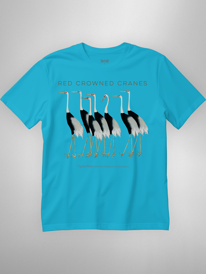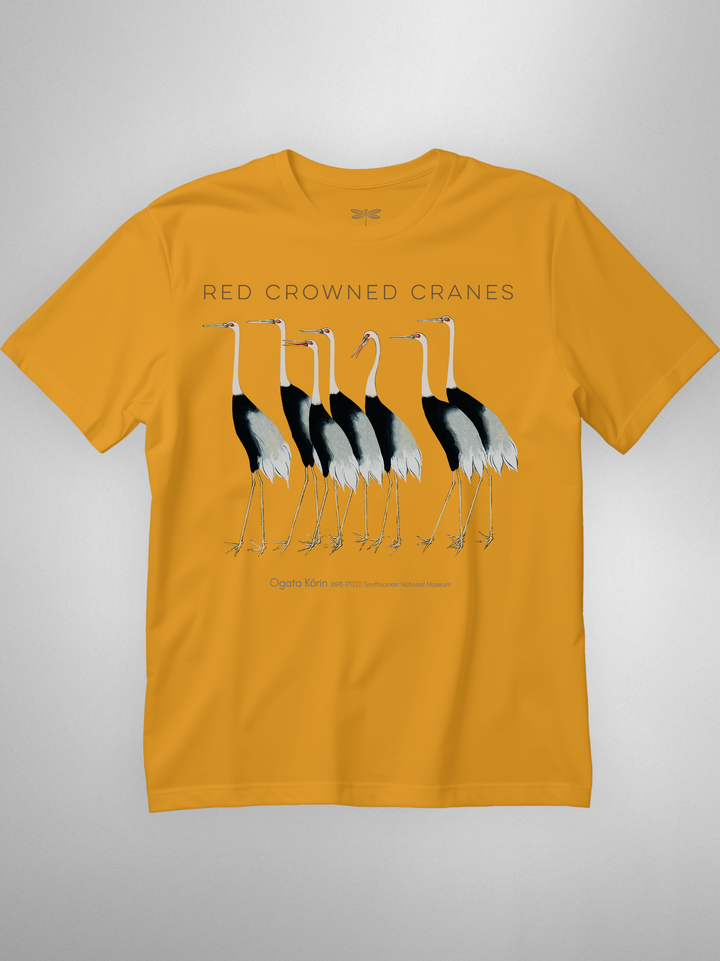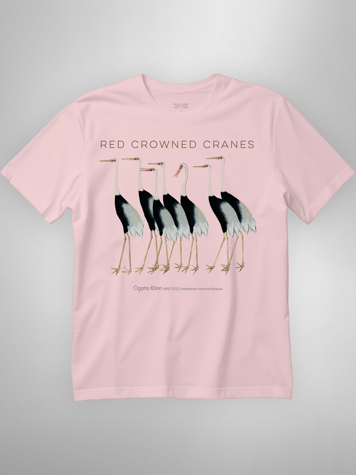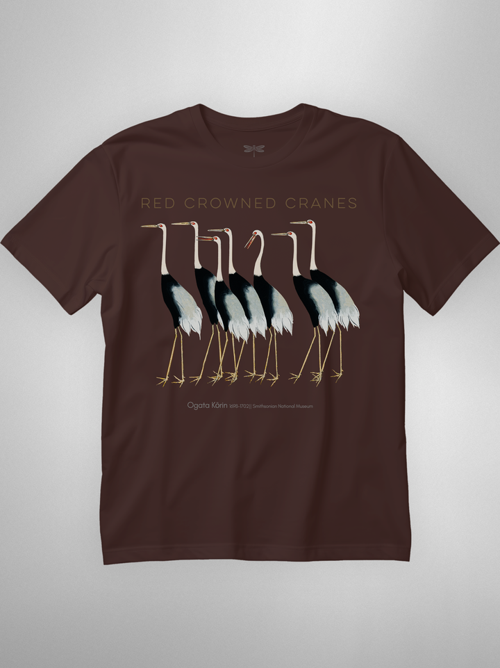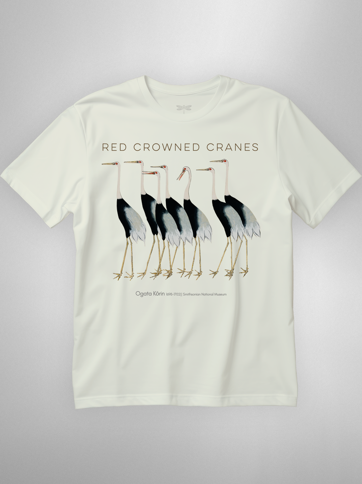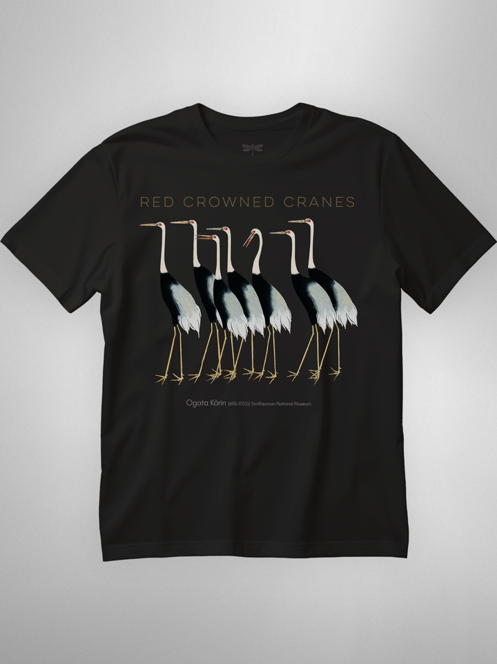 Product features Red Crowned Cranes (丹頂鶴) by Ogata Kōrin, c. 1698–1702. The artwork depicts a procession of cranes rendered with graceful symmetry and restrained color, their slender forms embodying longevity and peace. The minimal composition and rhythmic balance reflect the Ukiyo-e sensibility — where harmony, nature, and elegance converge in timeless form.