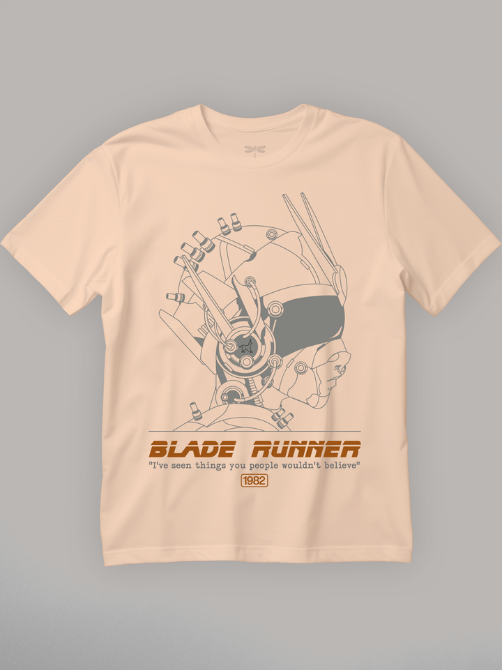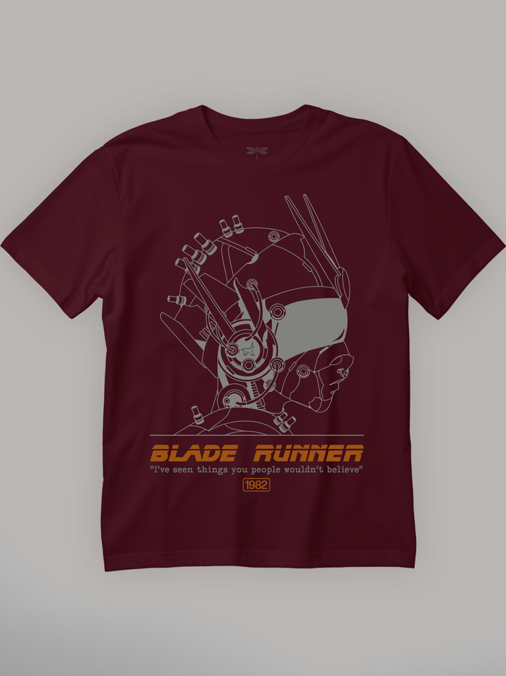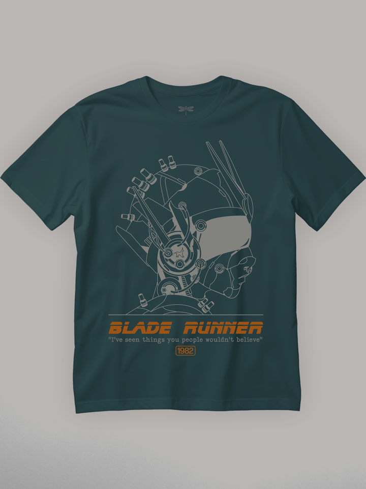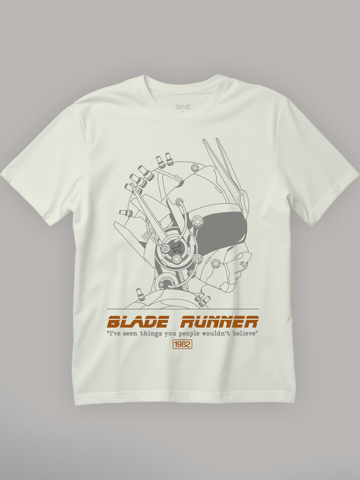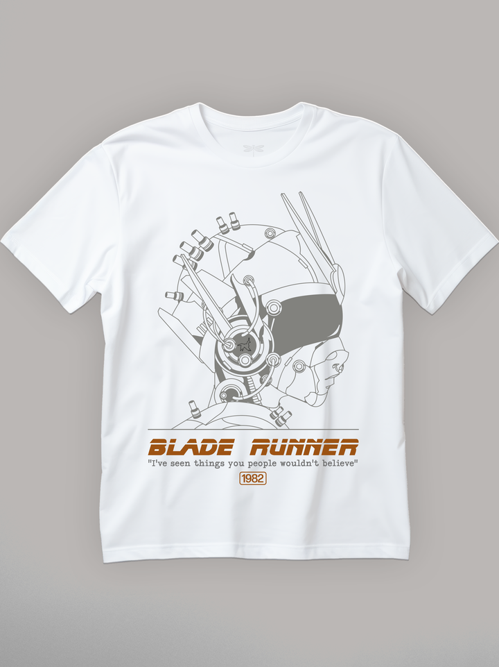 A visual homage to Blade Runner (1982), Ridley Scott’s dystopian masterpiece where synthetic beings struggle to find meaning in a decaying neon world. The design portrays a replicant’s profile — wires, circuits, and steel merging into something eerily human. Below it lies Roy Batty’s final words: “I’ve seen things you people wouldn’t believe.” Spoken moments before his death, the line captures a machine’s fleeting encounter with beauty and mortality — the echo of a human soul inside an artificial shell. Part of the Cult Movies collection.