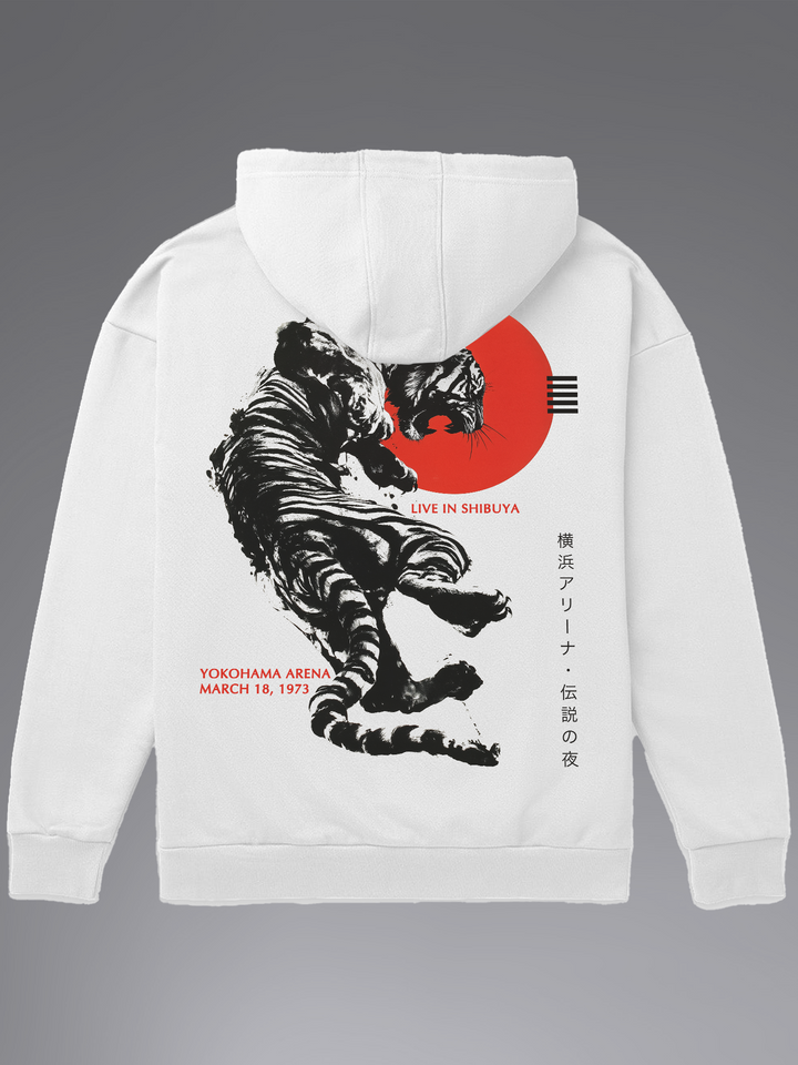 Product features a ferocious brush-stroke tiger mid-leap, set against a bold red sun and accented with Japanese typography. Inspired by The Rolling Stones’ fiery stage presence and their global tour legacy, this design captures the wild energy of a live show through Japanese ink-style artistry. Part of the ’60's Rock' Collection.