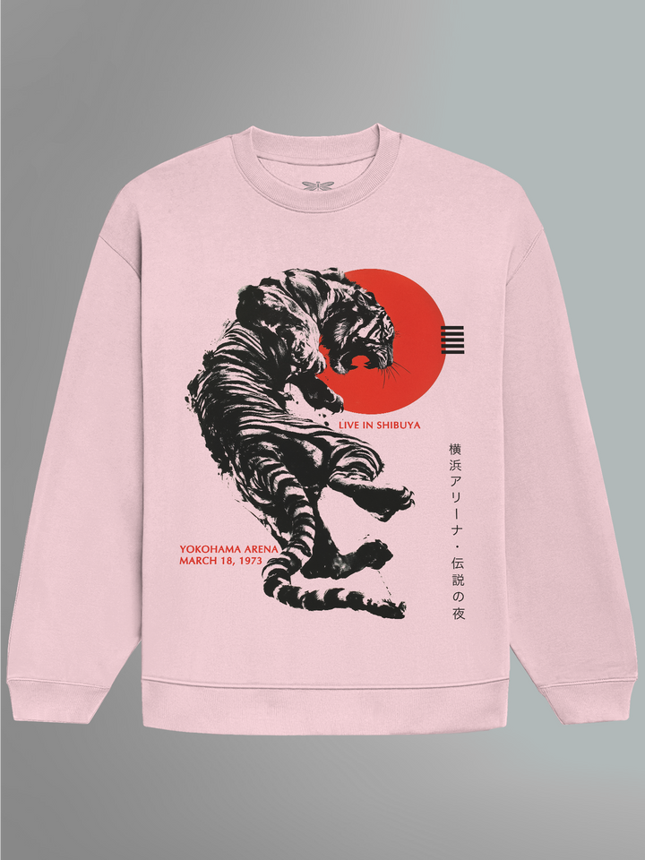 Product features a ferocious brush-stroke tiger mid-leap, set against a bold red sun and accented with Japanese typography. Inspired by The Rolling Stones’ fiery stage presence and their global tour legacy, this design captures the wild energy of a live show through Japanese ink-style artistry. Part of the ’60's Rock' Collection.