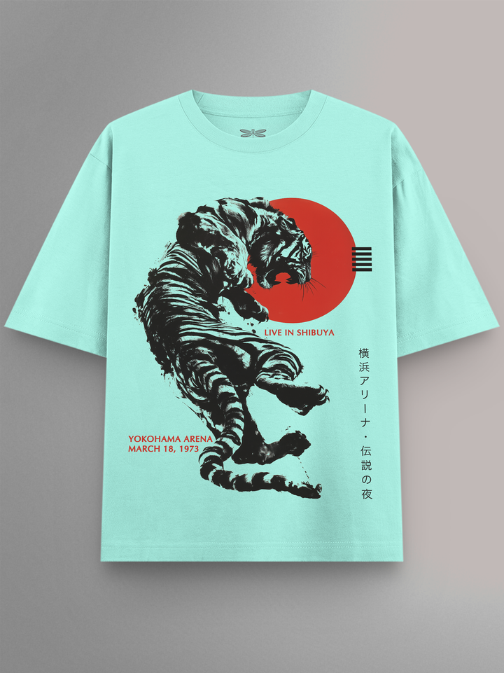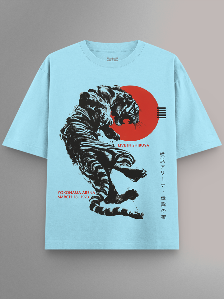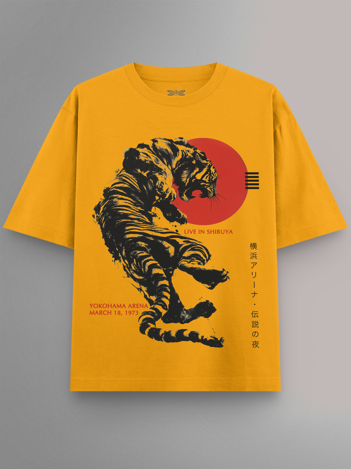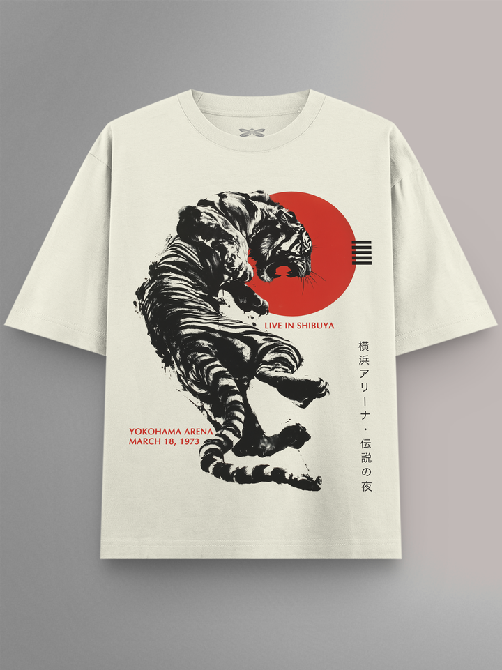 Product features a ferocious brush-stroke tiger mid-leap, set against a bold red sun and accented with Japanese typography. Inspired by The Rolling Stones’ fiery stage presence and their global tour legacy, this design captures the wild energy of a live show through Japanese ink-style artistry.