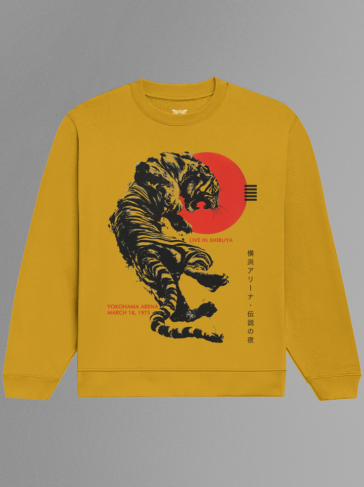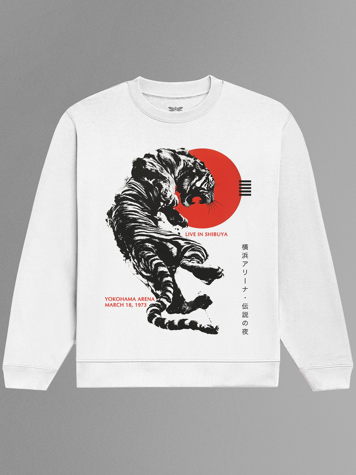 Product features a ferocious brush-stroke tiger mid-leap, set against a bold red sun and accented with Japanese typography. Inspired by The Rolling Stones’ fiery stage presence and their global tour legacy, this design captures the wild energy of a live show through Japanese ink-style artistry. Part of the ’60's Rock' Collection.
