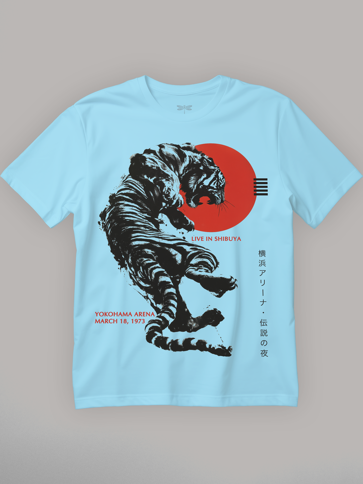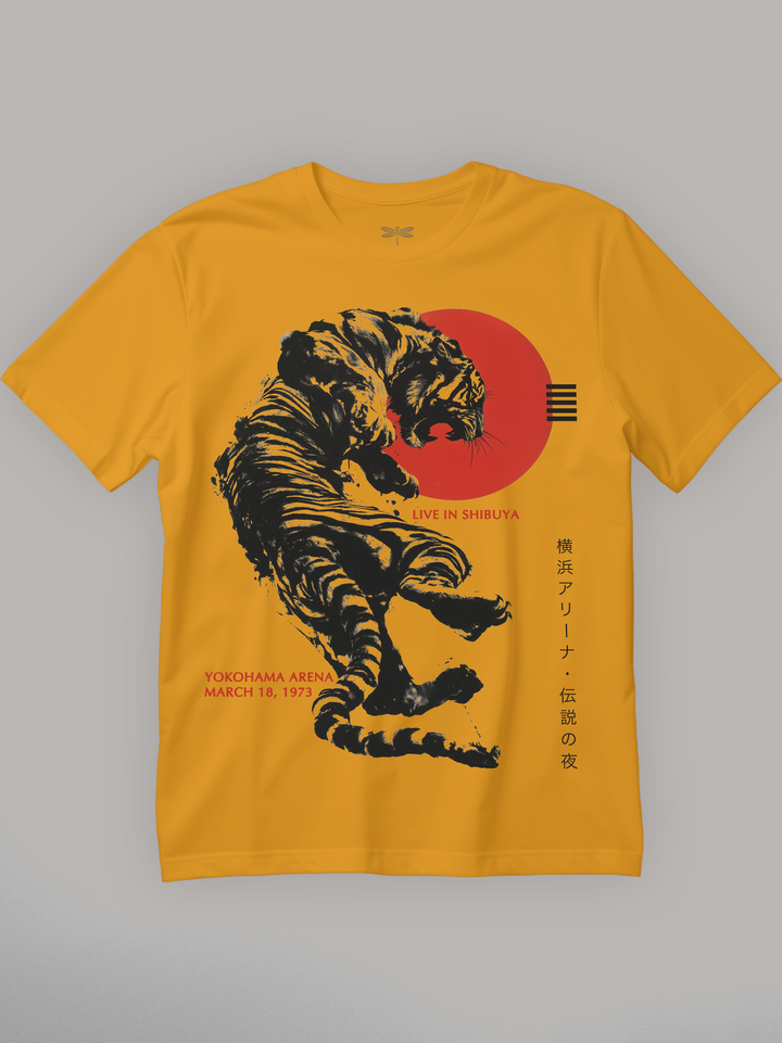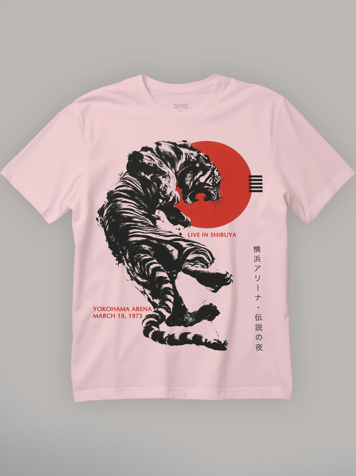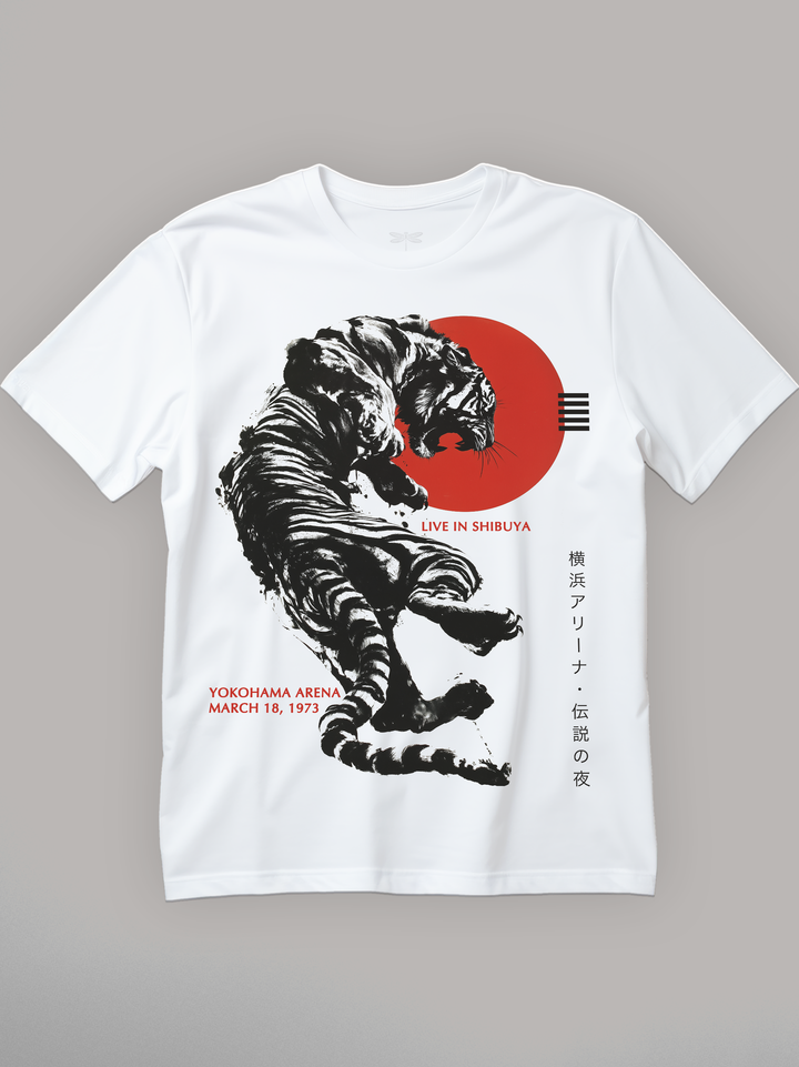 Product features a ferocious brush-stroke tiger mid-leap, set against a bold red sun and accented with Japanese typography. Inspired by The Rolling Stones’ fiery stage presence and their global tour legacy, this design captures the wild energy of a live show through Japanese ink-style artistry.