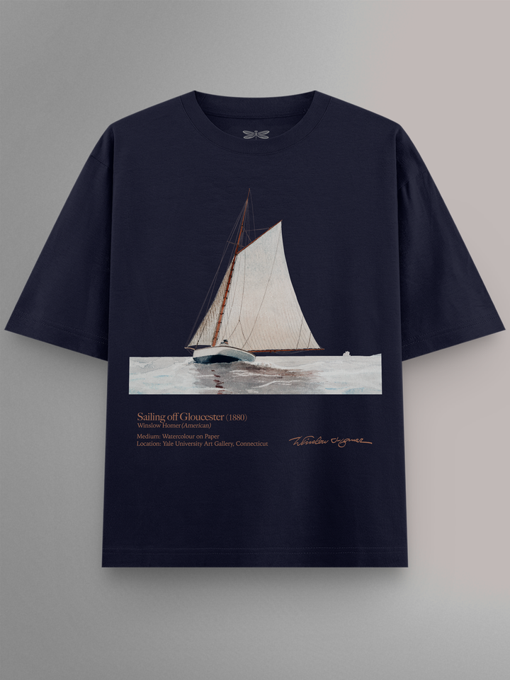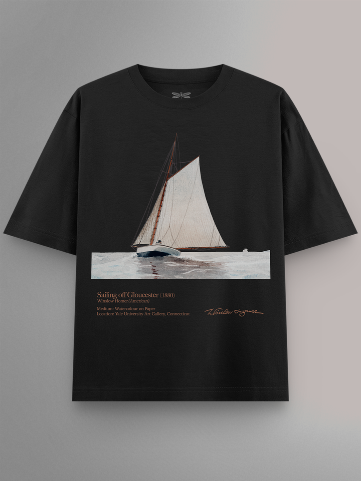 Product features Sailing off Gloucester (c. 1880) by Winslow Homer, known for luminous American realism and masterful marine watercolors. Painted from life along the Massachusetts coast, it captures a gaff-rigged yacht cutting cleanly through wind and tide—Homer’s spare washes doing the work of waves, spray, and sky. A cool fact: in the late 1870s–1880s Homer helped elevate watercolor from sketch medium to museum art with portable, plein-air works like this. Housed in the Yale University Art Gallery, New Haven. Presented in a refined design as part of the Art Movement Collection.