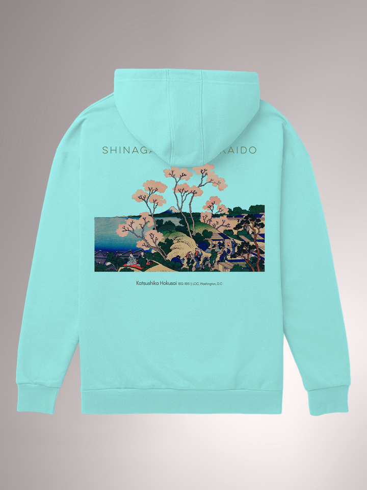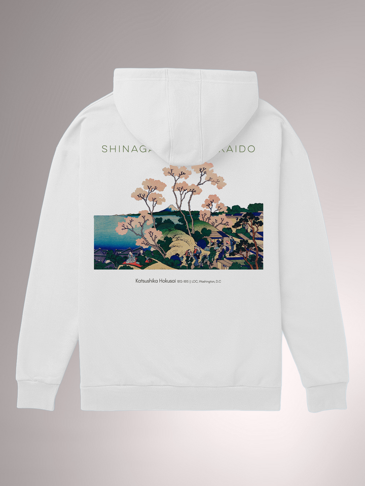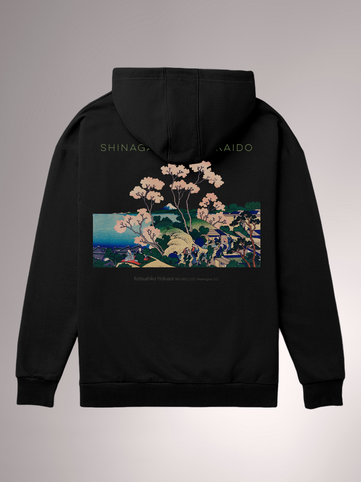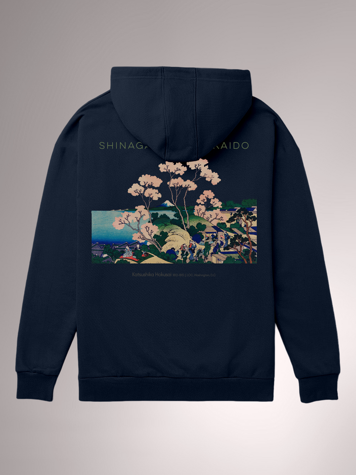 Product features Shinagawa on Tokaido (品川 東海道) by Katsushika Hokusai, c. 1812–1815. The print depicts travelers and townsfolk along the bustling Tōkaidō road, framed by blooming cherry trees with Mount Fuji rising in the distance. The vivid contrasts and layered perspective embody the Ukiyo-e tradition — transforming everyday journeys into scenes of beauty, movement, and timeless harmony.